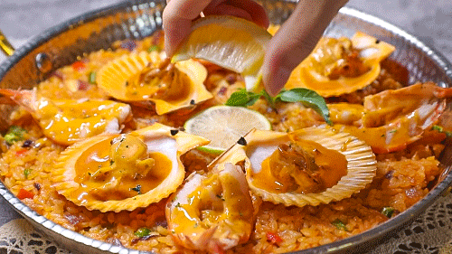 米饭的金黄源自于名贵的香料藏红花,烩饭中的蔬菜粒也需要切到合适的大小,再搭配上鲜虾和贻贝。正宗的烩饭其实是夹生的但是为了迎合国人的口味和饮食习惯,喵呜西班牙烩饭的料理都做了断生处理。