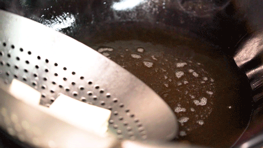 师傅要先将豆腐放进油锅里炸至金黄色后方可出锅,这一步火锅要拿捏好,差一点多一点都会影响到口感。