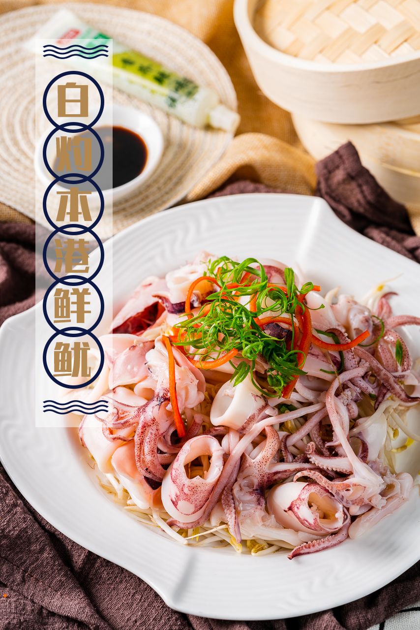 白灼鲜鱿店家会搭配酱油蘸着入口,能接受芥末的饿魔我推荐可以蘸点芥末,味道鲜美,回味无穷。
