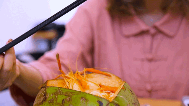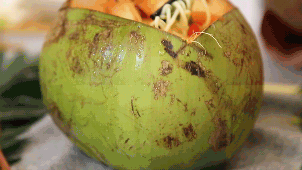 纯椰汁熬汤,放入各种香料,逼出其精华融入汤内,再加入大虾。最后重头戏来啦!倒进椰子里,浓浓的椰香混入冬阴功的热烈,在椰子里吃面,你是第一次吗!