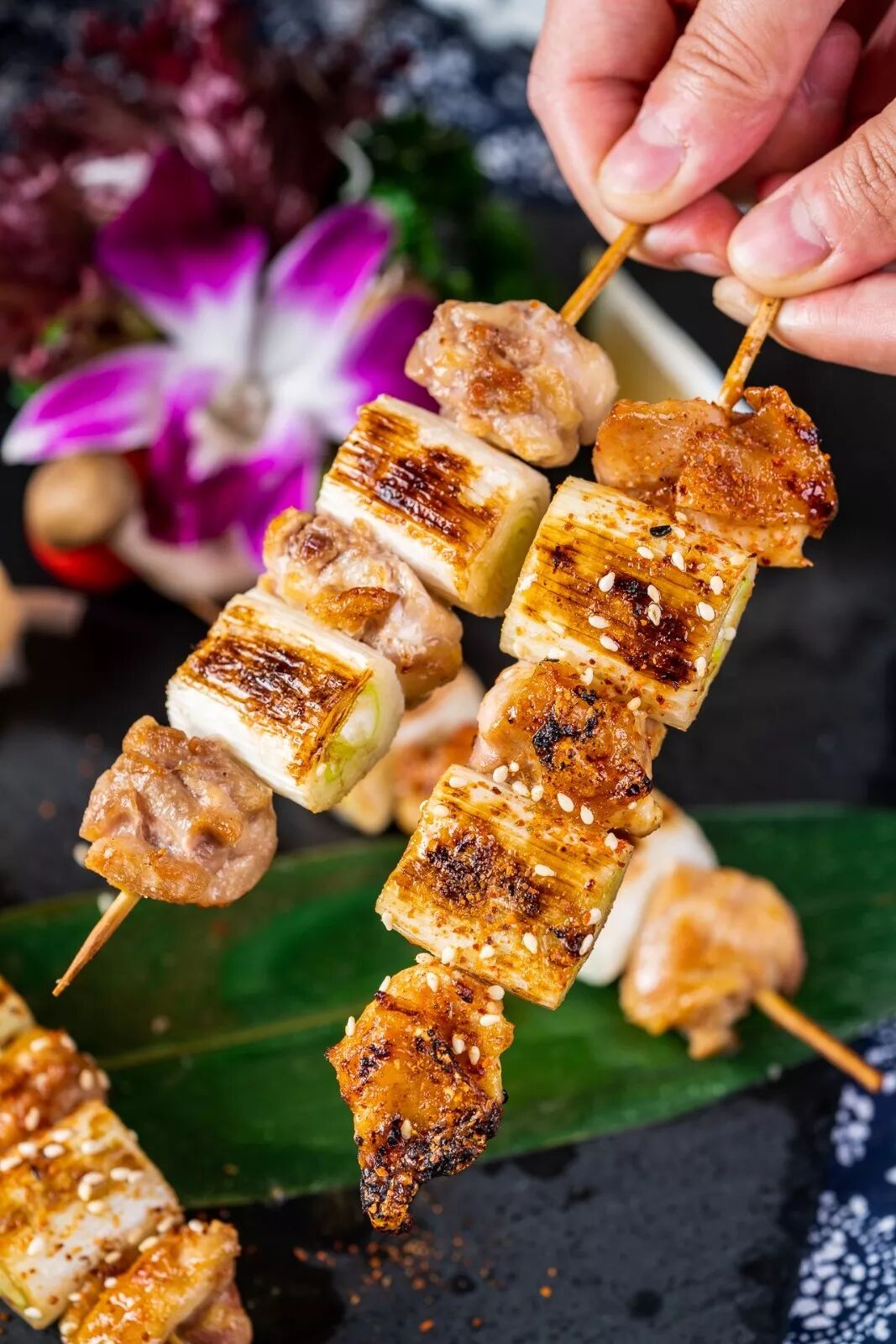 京葱汁烧鸡肉串&京葱烧鸡肉串是烧鸟里最常见也是十分受大众欢迎的烧物,选取最嫩滑的鸡腿部分,加上大葱最嫩的部分,撒上盐后烤制熟透。