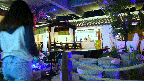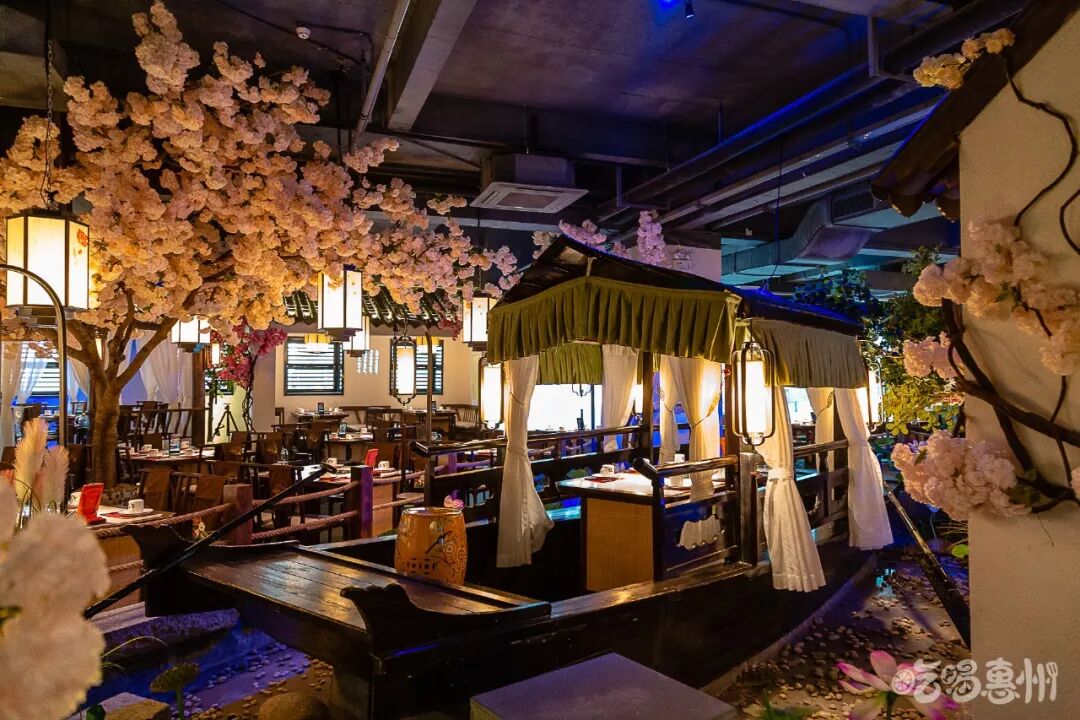 老板在惠州这块地直接承包了1000平方米的场地,打造了一个梦幻烟雨蒙蒙的江南场景,复古式的凉亭、游荡在水中的船舶,来这儿涮火锅的人都很喜欢在船里吃。