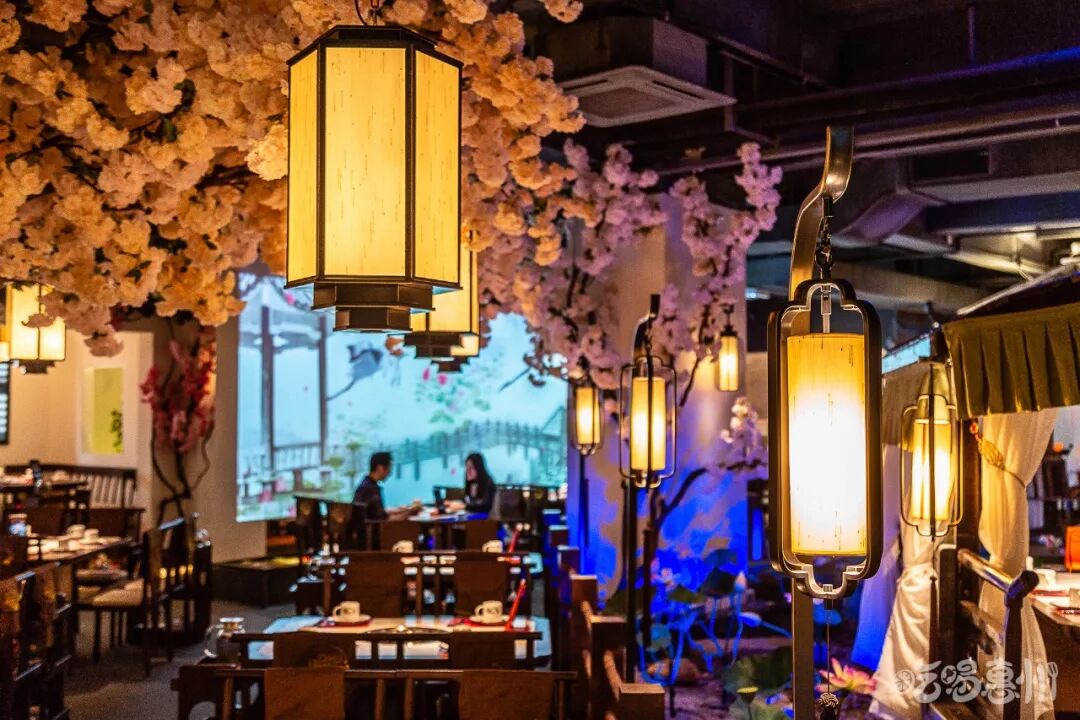 还有墙上与屋顶的樱花树与灯笼交相辉映,让人十分舒适,有种来到了世外桃源的感觉。