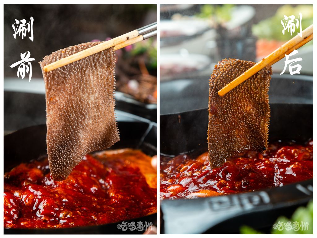 涮毛肚只需要遵循“七上八下”的原则涮熟,熟后的毛肚会微微卷翘,还没有入口就已经感受到毛肚的爽脆。