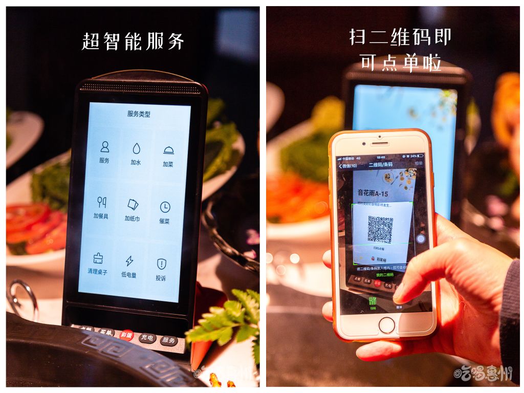 店里的这个服务机器超级智能哦,不论是加水还是加菜或是买单,都可以在座位上完成,再也不用担心排队啦。