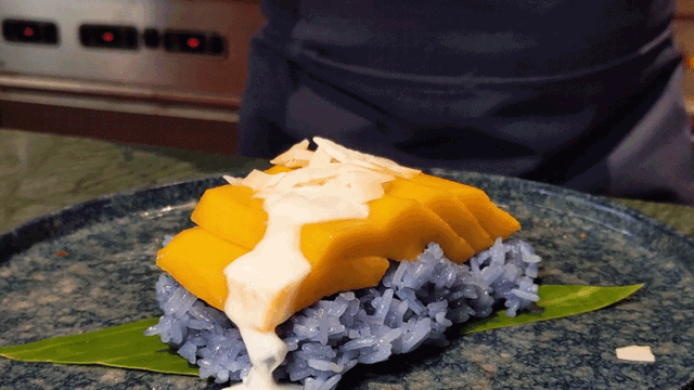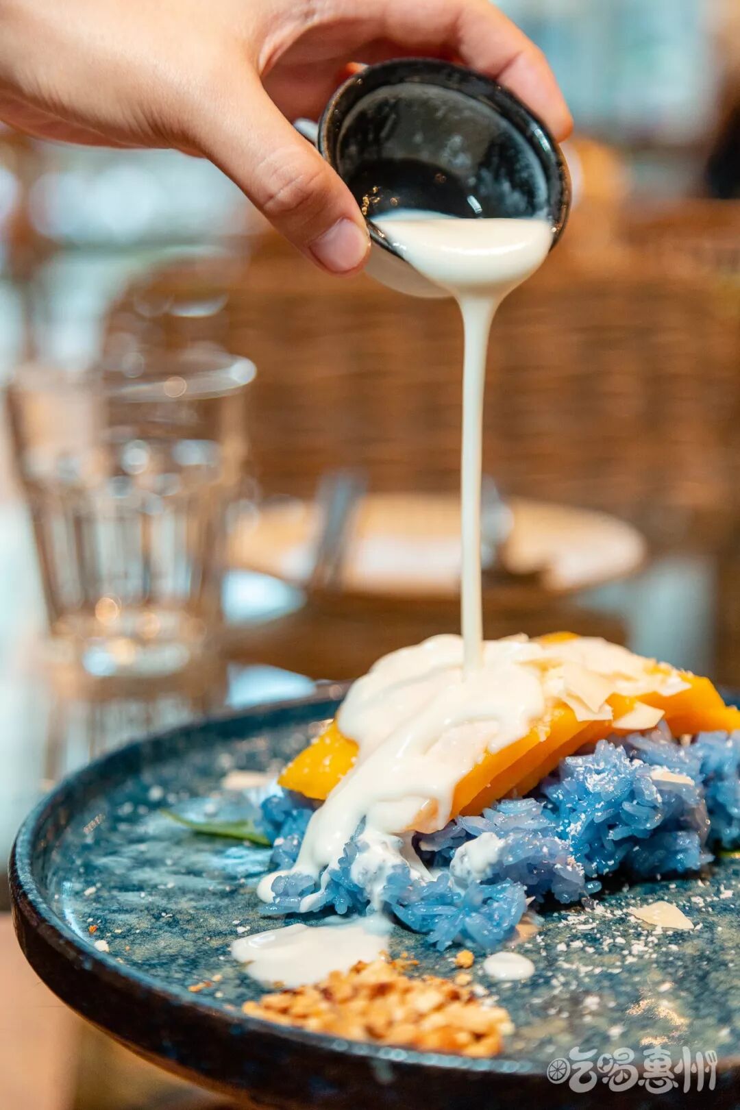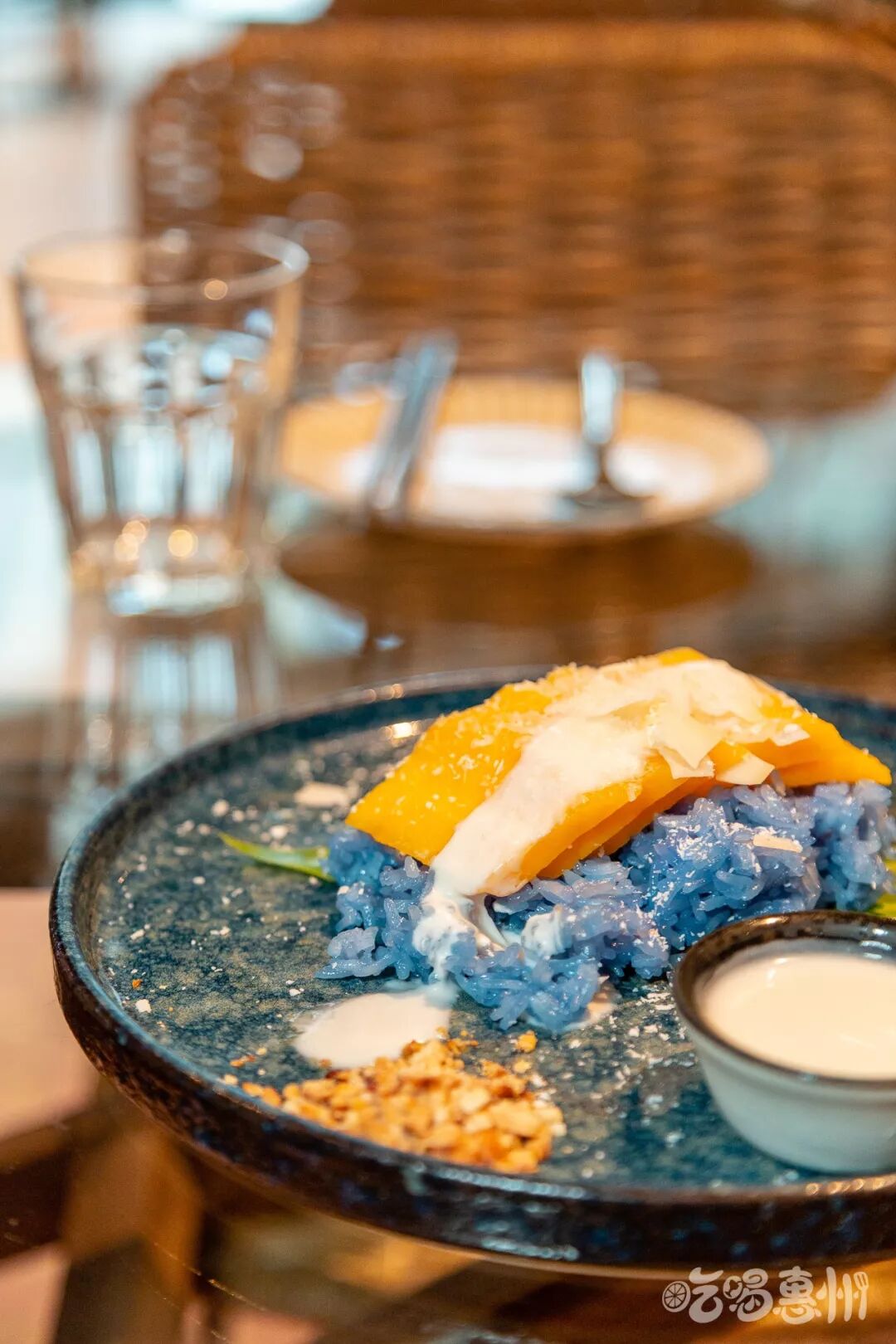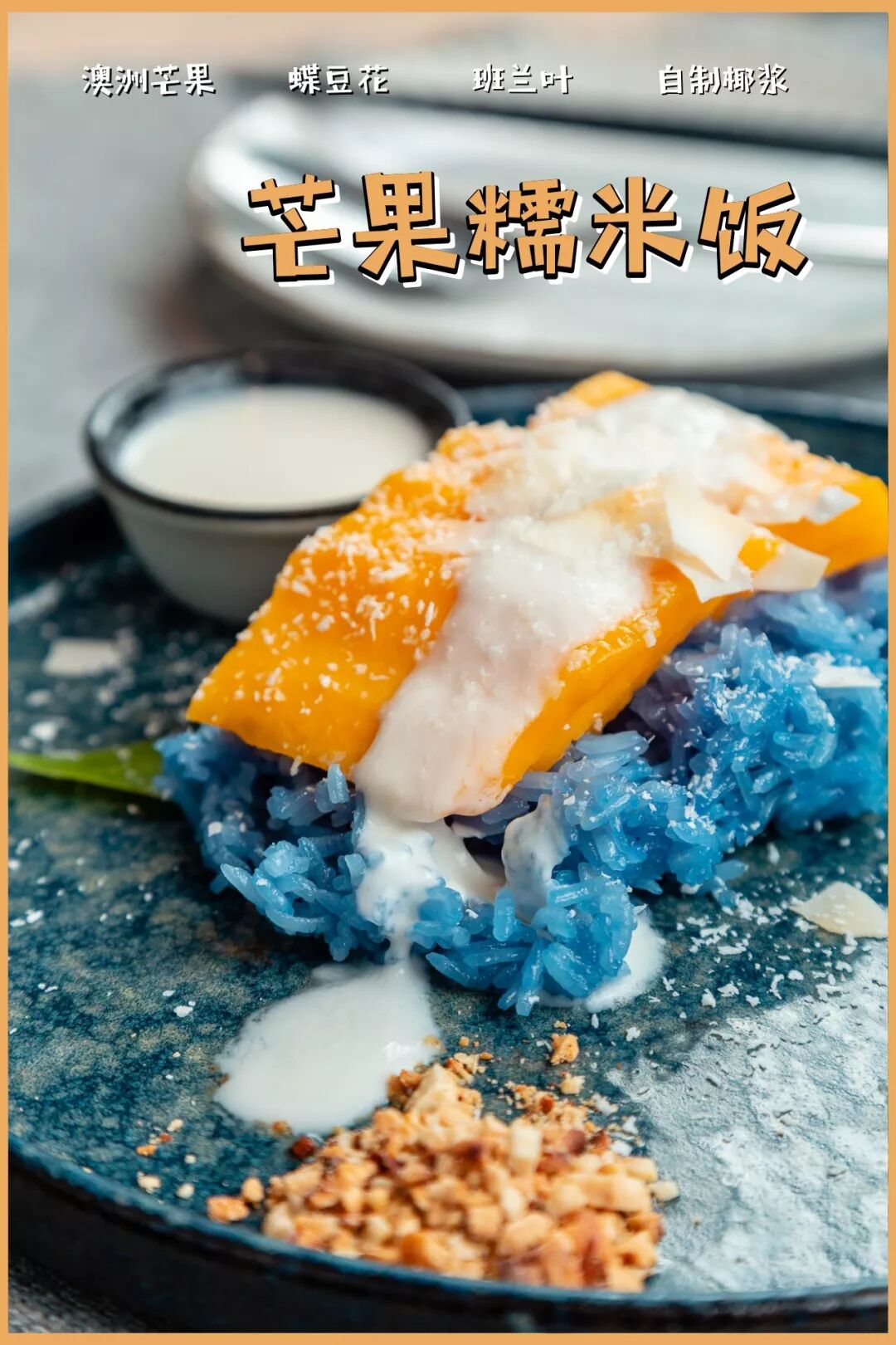 很吸晴的一款爆品,特别是它蓝紫色的糯米饭,放入了南姜、香茅,和黄灿的澳芒搭配一起,真的忍不住拿起手机拍了一翻~