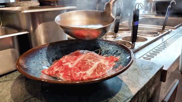 特别的是这里的牛肉,选用澳洲牛肉,肉的质感很好,口感也很细腻,嚼起来能够吃得到丰富的肉质,用200°c的牛骨汤浇上去,瞬间就变色了~但不会破坏肉的味道。