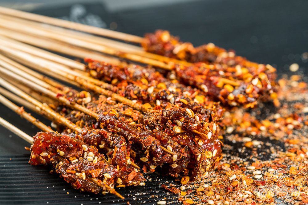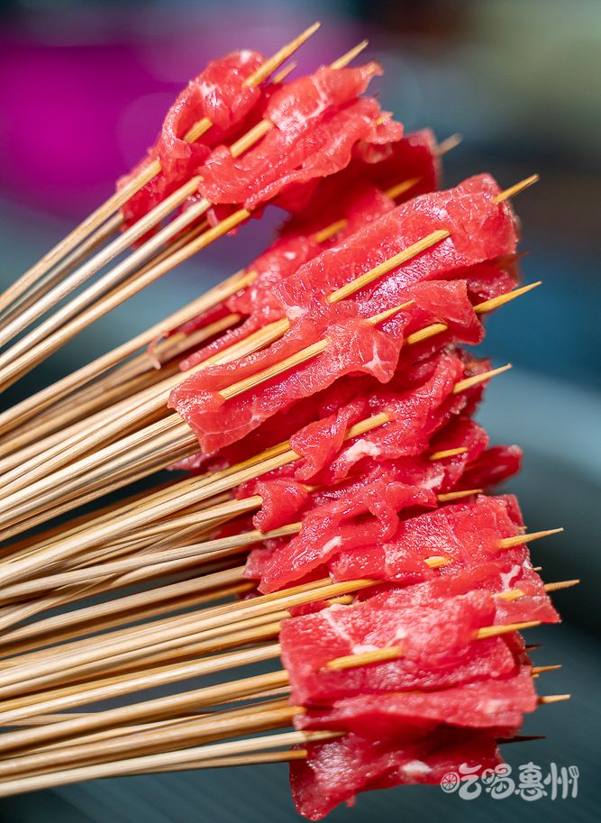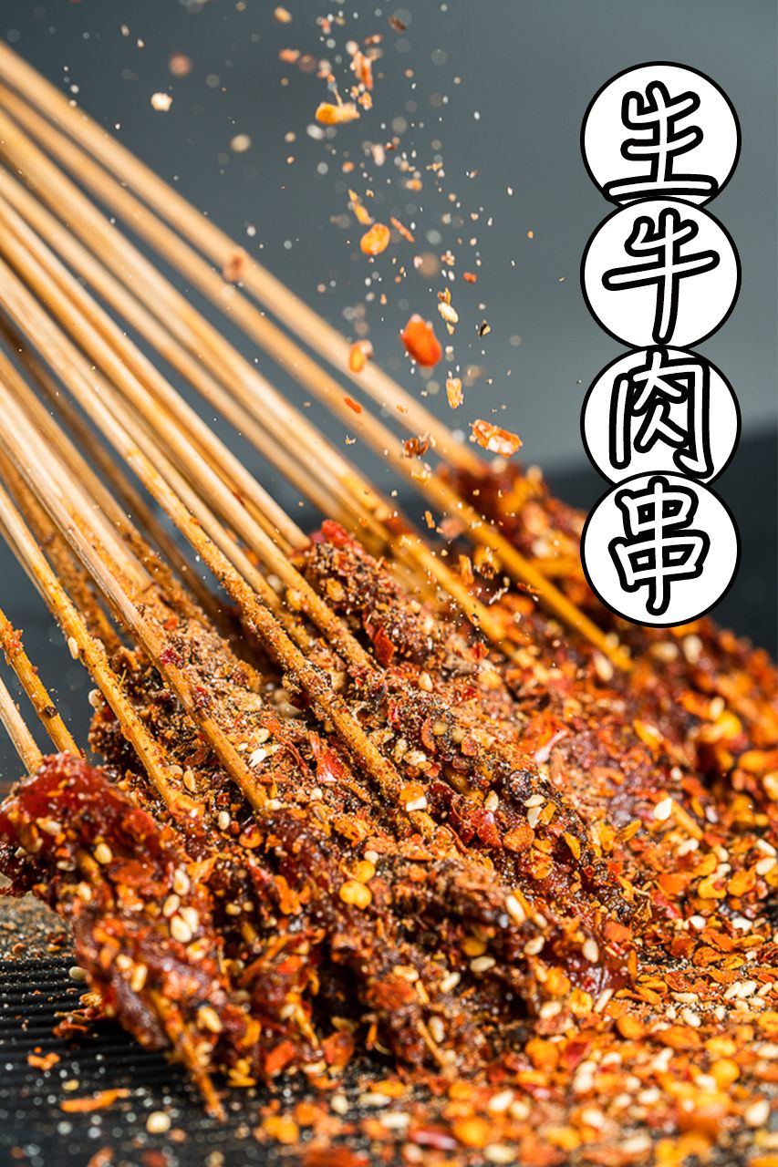 生牛肉串腌制得特别入味,肉质很细腻,入口完全吃不出是生肉。不蘸料直接吃,能吃出牛肉的鲜甜和腌料的麻辣香。