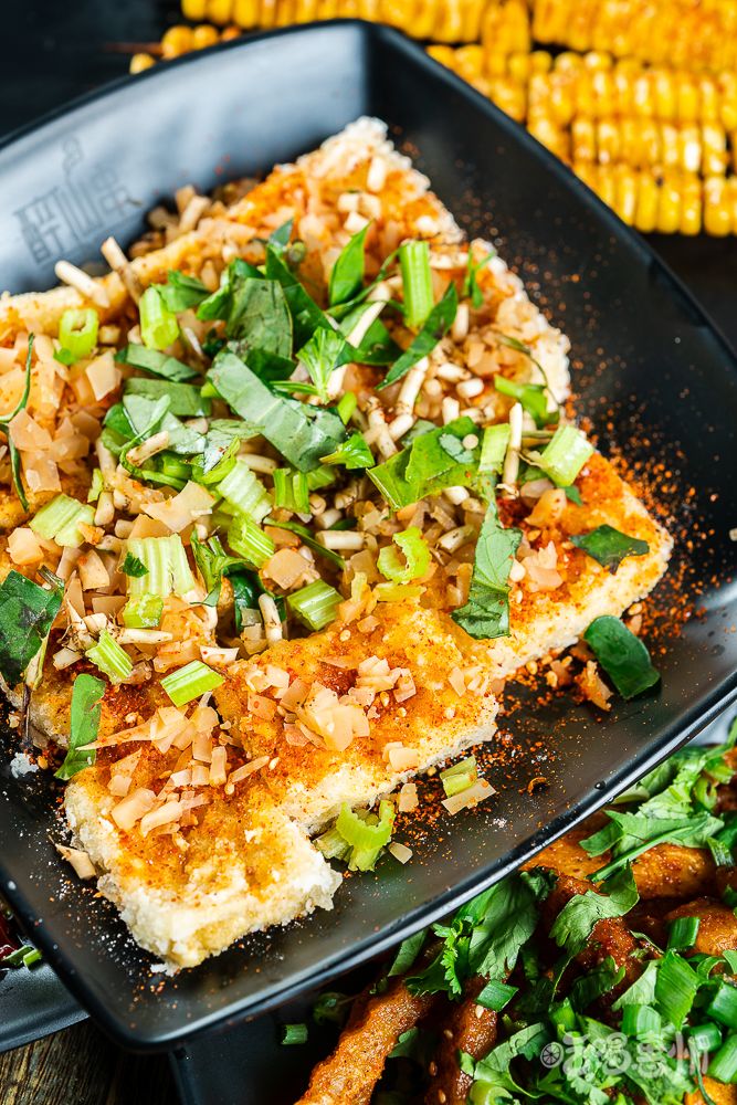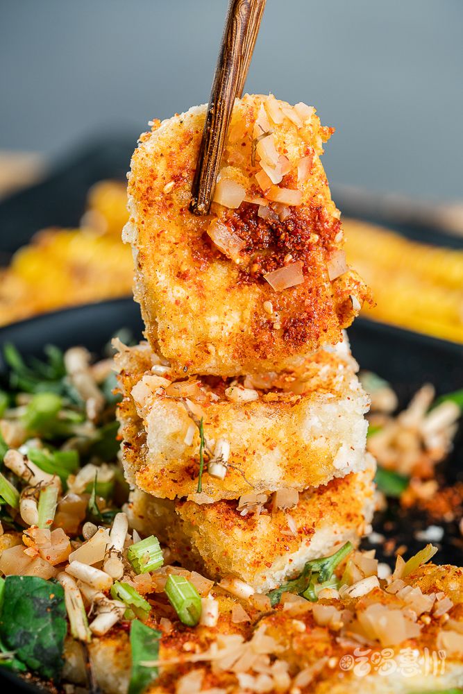 豆腐外酥里嫩,外皮脆了,里面依旧是湿润的。撒上了折耳根和辣椒,还有微微的发酵香气。一口下去,能感受到喜欢浆水在口中爆开的感觉。