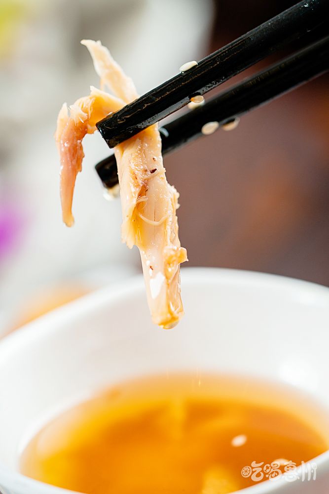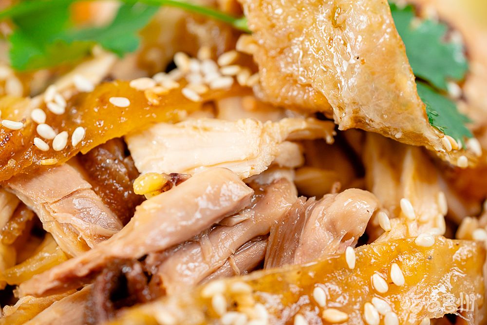懂吃的人都会先挑一口嫩滑的鸡皮吃,鸡皮很嫩,薄得能透光。打开鸡皮,会看到已经被手撕好的鸡肉。