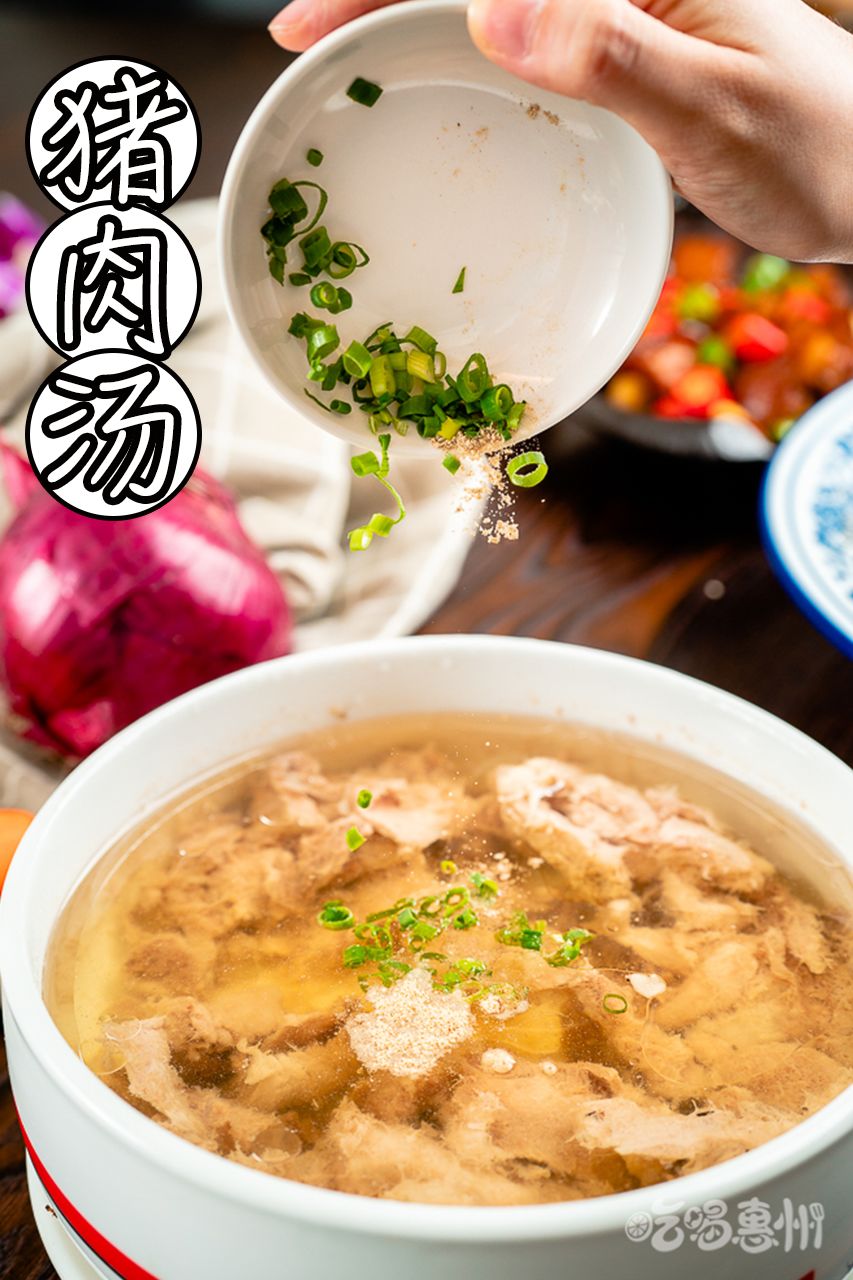 土猪汤食材单纯却不简单,水和土猪肉,盅盅炖足40分钟。客家人都知道,撒上胡椒和葱花是必备动作,更能提升汤的鲜味。