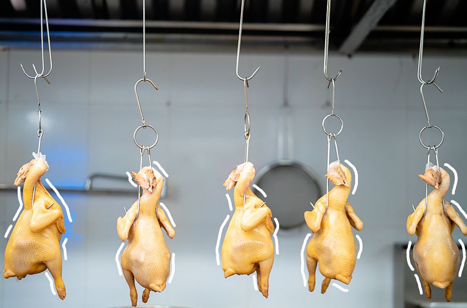每只鸡都是经过精挑细选,大小都是有讲究的,鸡肉的皮下层脂肪含量刚刚合适。