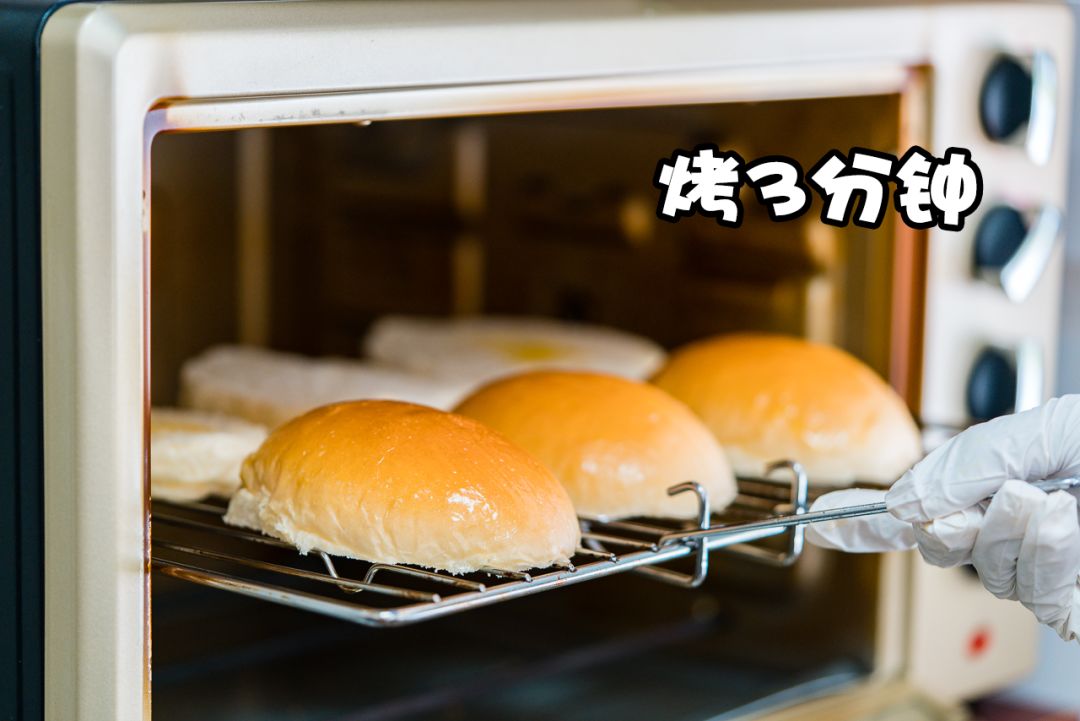 扫上安佳黄油后,将其放进烤箱中烘焙3分钟左右即可。出来的面包皮香气诱人,光这面包皮我都能吃3个!