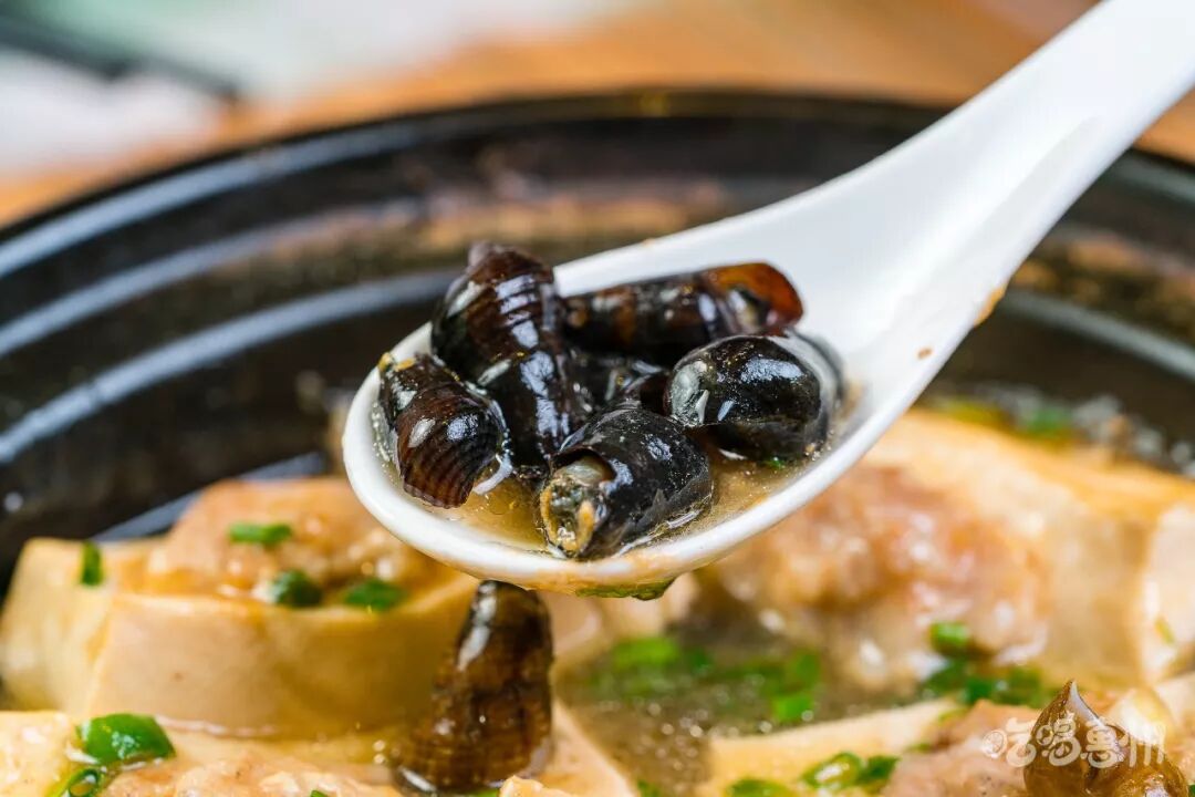 老板为了做出这一道豆腐煲,直接熬制了一整锅鸡汤来入味。为了提鲜,将坑螺洗涤干净,去掉壳尾放入豆腐煲中一起烹调。