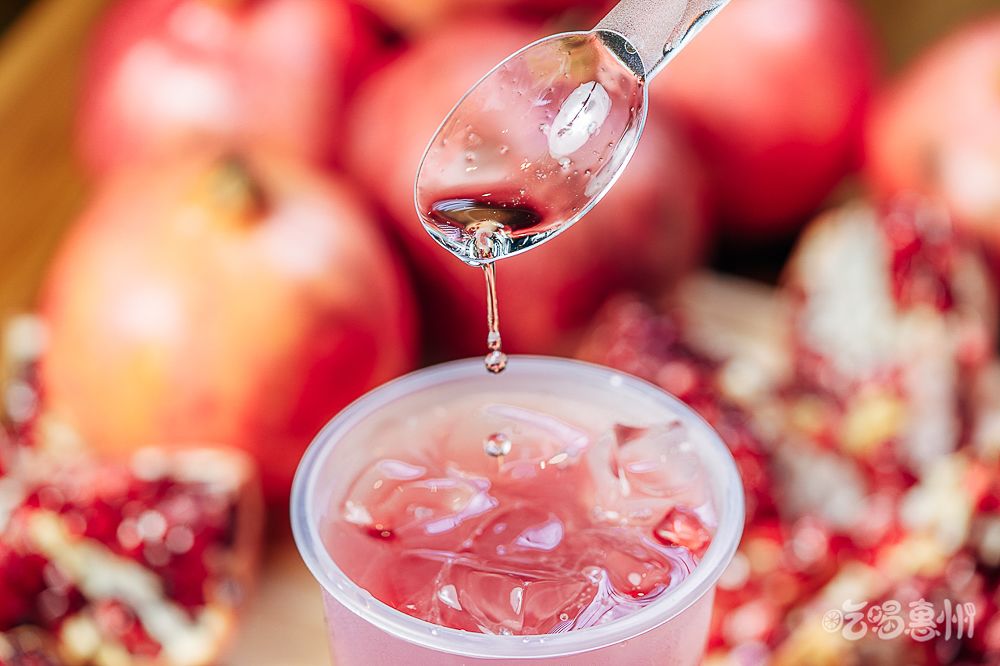 底下是一大勺石榴果肉和脆波波,剥出来的石榴果粒一部分用来打碎滤渣,和云峰茶底混合,还会特别加入苹果增加口感。