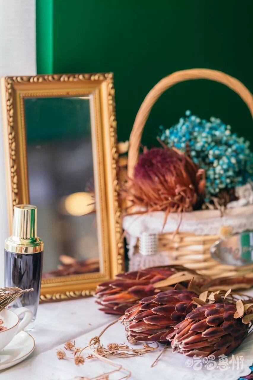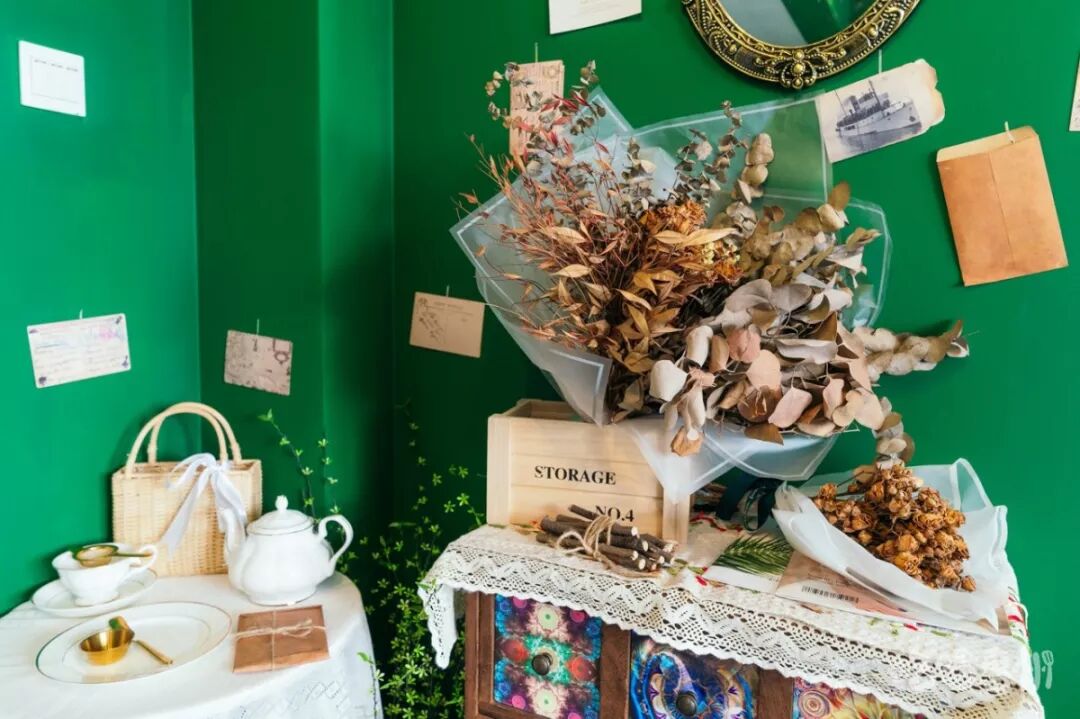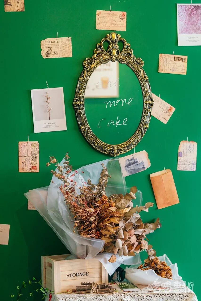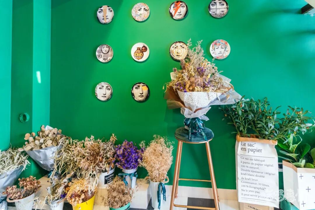 店里还有许多干花束,可以在这儿放肆拍拍拍,祖母绿的墙面特别显眼,墙上的装饰也尽显复古风。