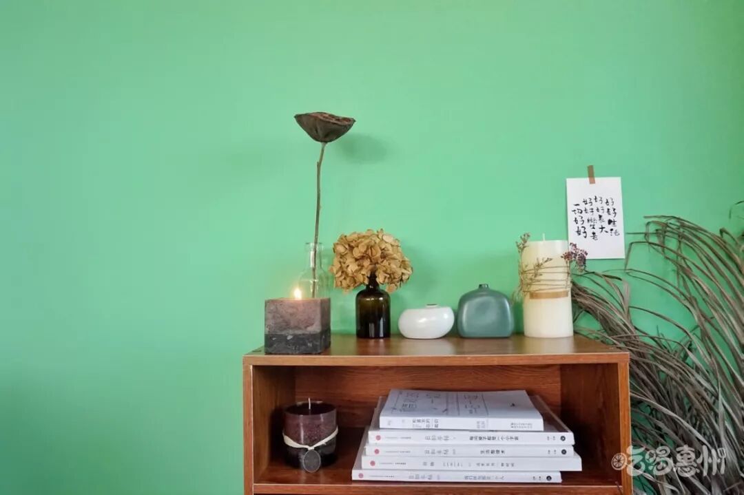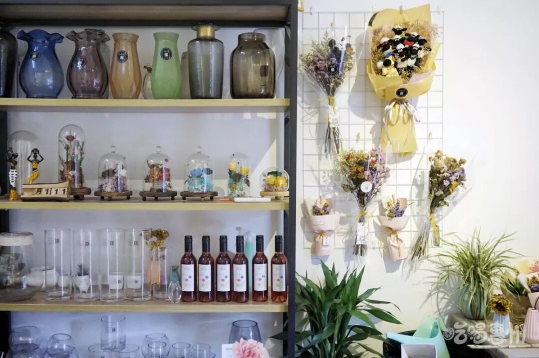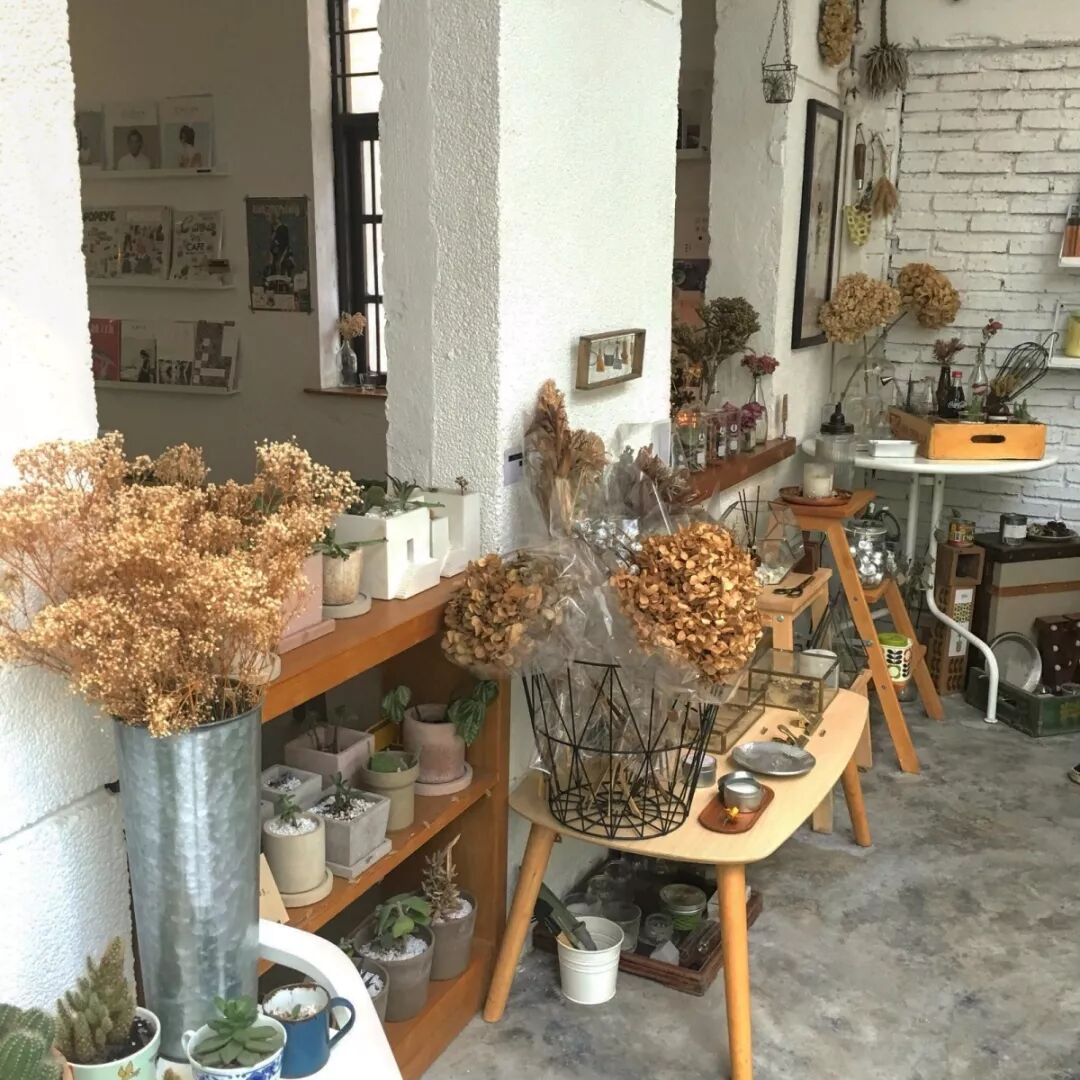 店里还有许多干花束,可以在这儿放肆拍拍拍,祖母绿的墙面特别显眼,墙上的装饰也尽显复古风。