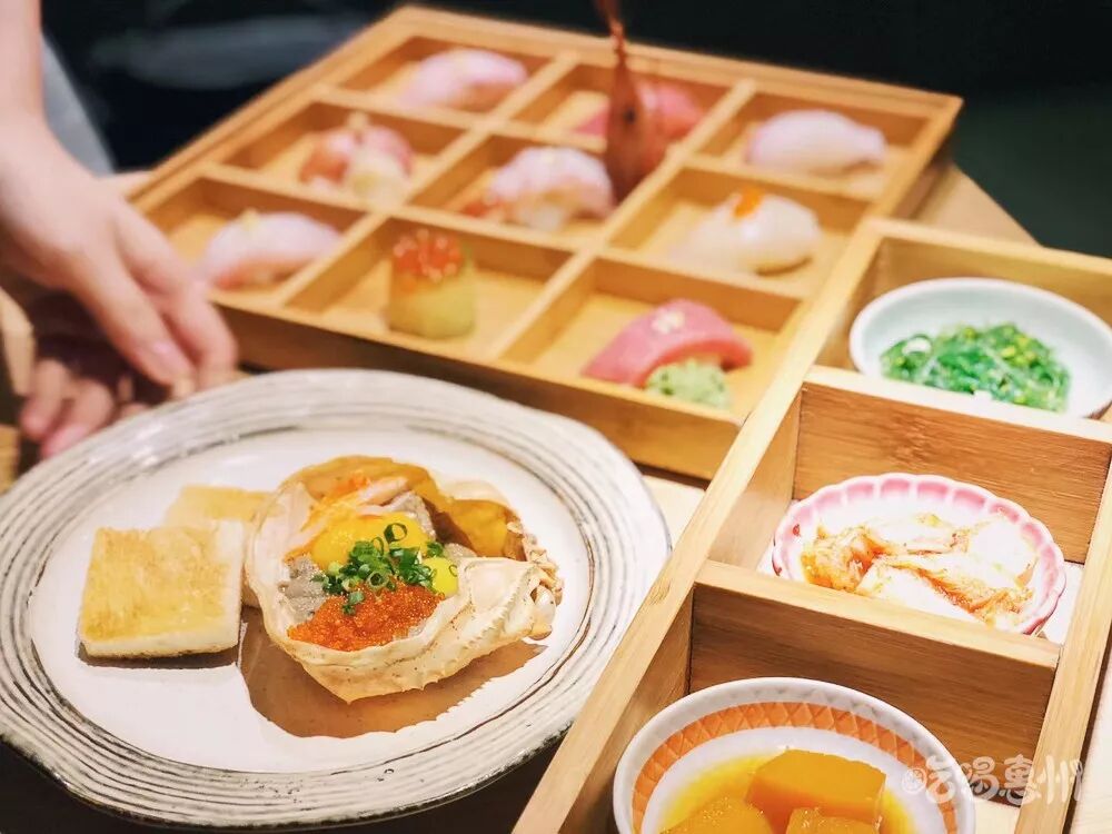 环境还挺有设计感的,最有名的就是那款九宫格寿司,188元一份,有款寿司是有金箔的。听说三文鱼和海胆也是不错的,不过我们没点。