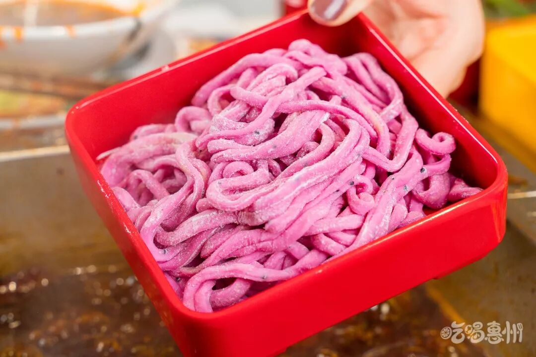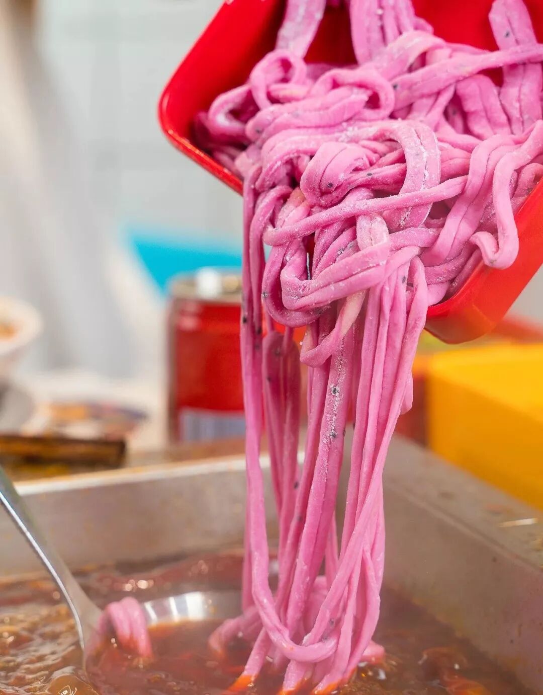 火龙果面:这家店真的创新连连呀,鲜艳的红色融入面粉,完全手工制作,粉粉嫩嫩的颜色,颜值瞬间变高。