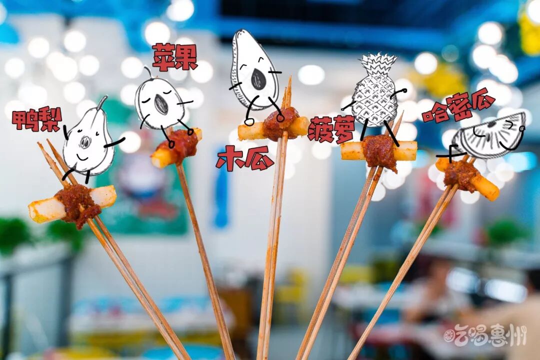 成都原装打包过来的水果串串,连店员的衣服都是别致的麻将牌,叫店员直接喊牌名就可以啦,墙上四处都是一起吃肉的slogan~