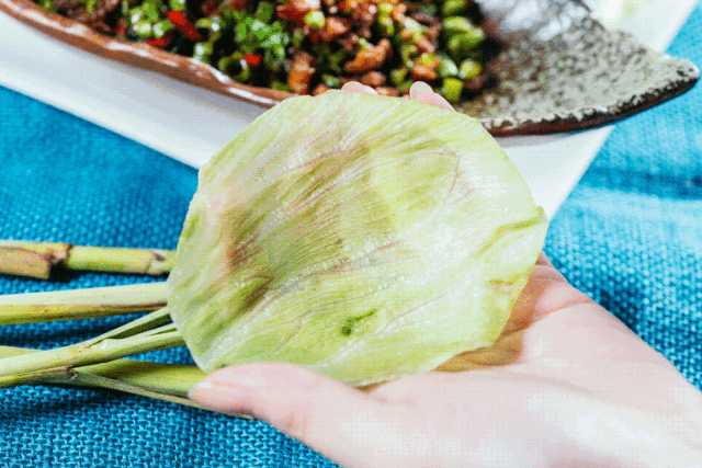 肉沫爆香后,加入九层塔和其他泰国香料爆炒,香气四溢!它虽然下饭,但正确吃法应该是拿生菜包着吃,如此更为浓淡适宜。