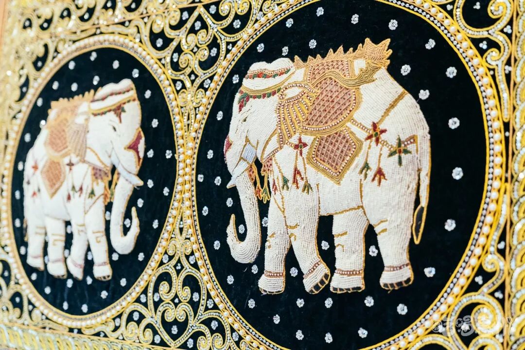 除了穿传统服饰的美貌小姐姐,这里随处可见blingbling的泰国传统的珠绣壁画,都是泰国人最爱的大象主题。
