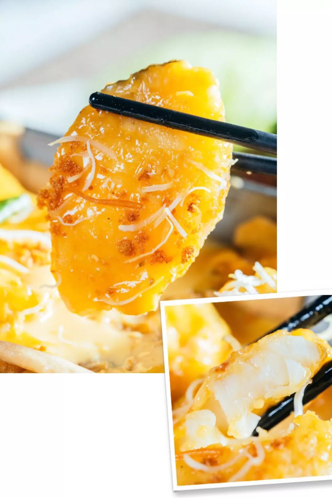 银鳕鱼肉鲜嫩无骨,最受懒人欢迎!一口咬下去肉质紧致鲜甜与奶沙汁很搭,让人回味无穷。