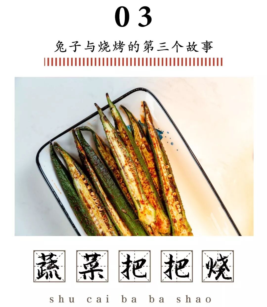 当秋葵这种神奇的蔬菜变成烧烤时,口感也变得神奇了,秋葵特有粘腻口感被香料感染,让人欲罢不能。