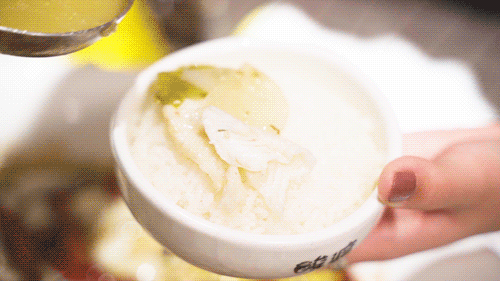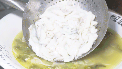 各种牛逼的佐料协助酸菜熬成酸香开胃的汤汁,先给鱼头泡个澡~焯好的鲈鱼片小心翼翼地落在汤面上,像极了柔软雪白的棉花糖。