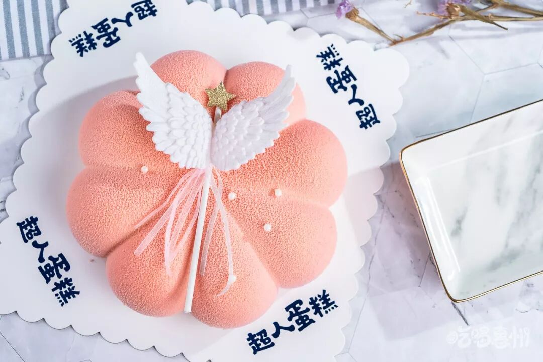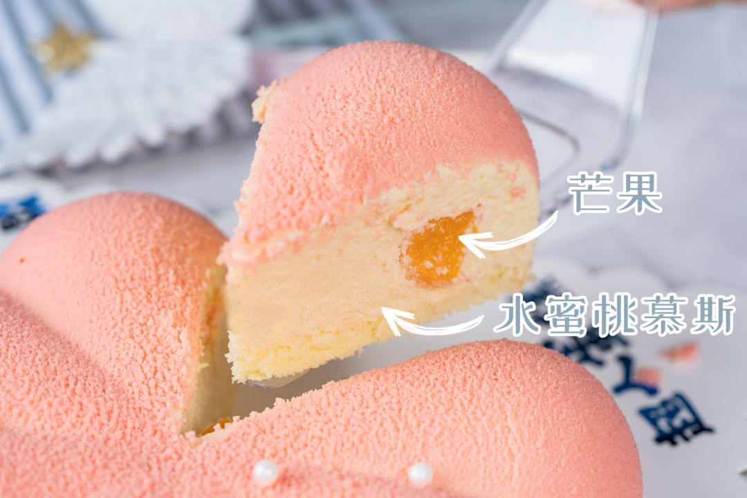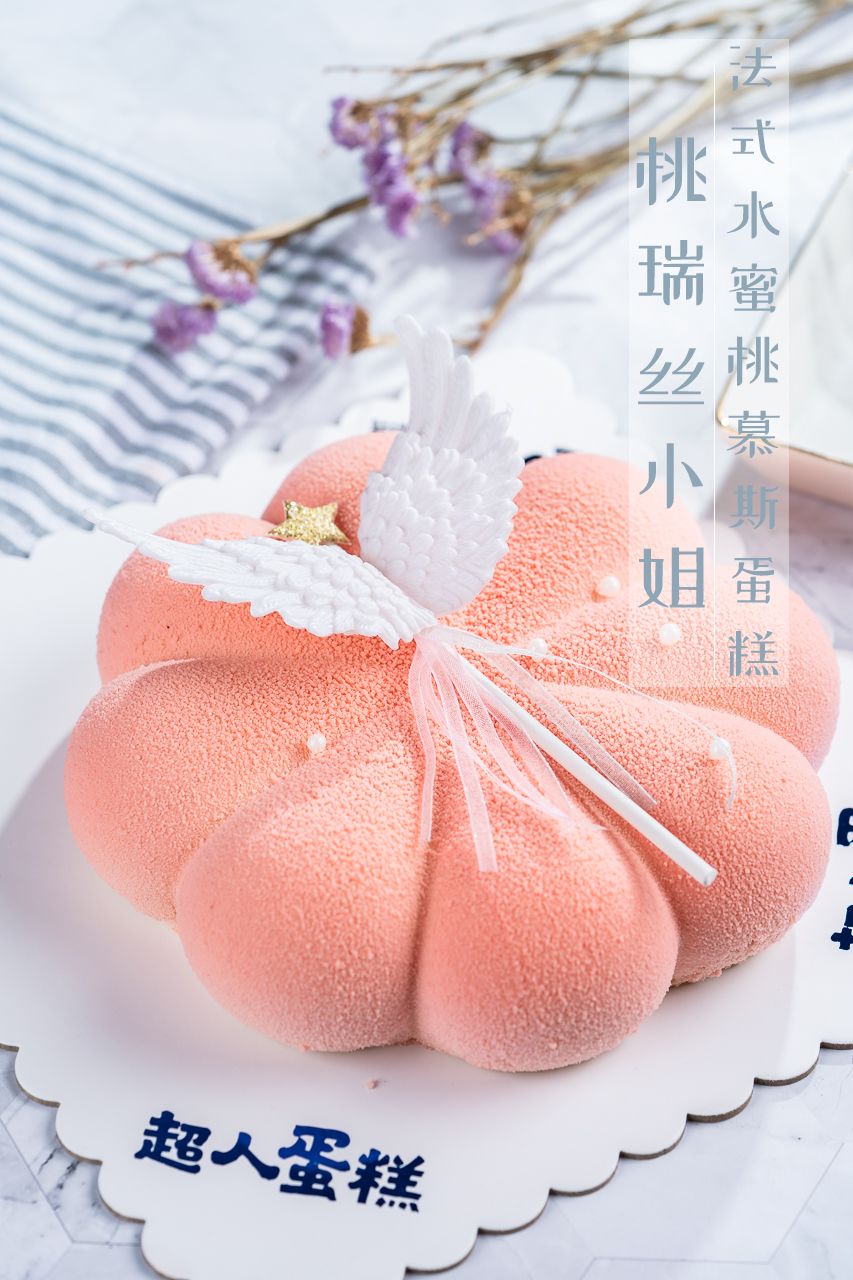 夏末秋初的季节,水蜜桃慕斯是最佳选择,这款粉嫩的水蜜桃慕斯一眼就惹人爱,上面铺满了水蜜桃果茸,加上的天使翅膀,少女感十足。