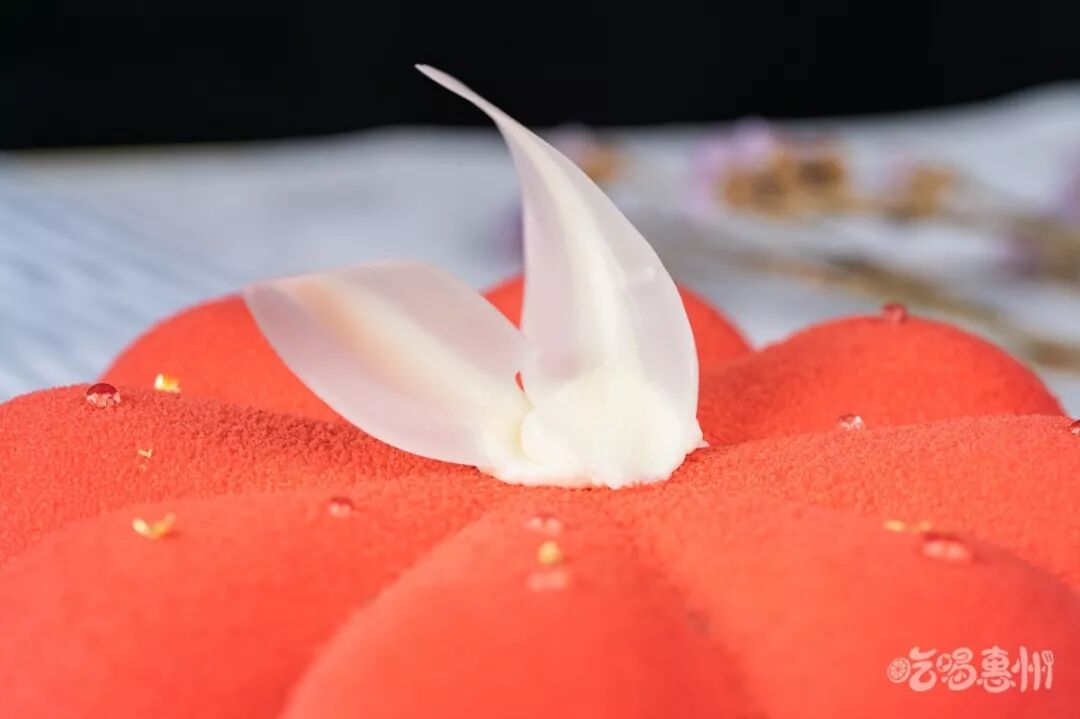 表面是樱花做成的镜面,里面的樱花为镜面做点缀,蛋糕本身的糖度控制得刚刚好,一点儿也吃不腻,下层的酸奶慕斯与蛋糕融合吃起来更有层次感。
