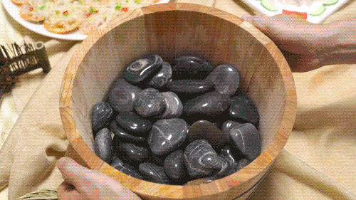 挑选好的鹅卵石先经过高温烘烤,高达300°C呢,光石头就7斤,这样才能起到导热保温的作用。