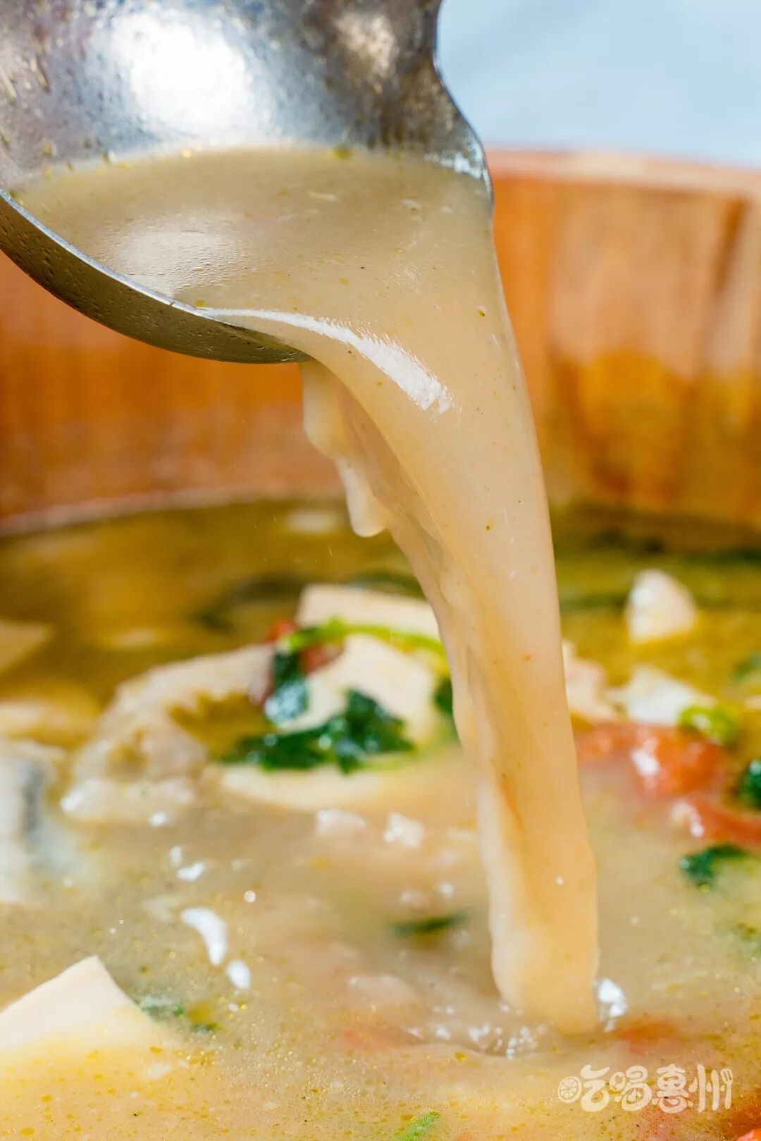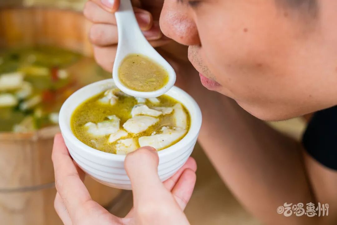 吃鱼先喝汤,是整桶鱼的精华,用蛋清腌过的鱼肉被热汤烫熟后,浮出精致的蛋花,第一碗一定要舀一碗纯汤,单独细品。