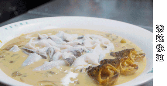 每条鱼都要经过切片、烫鱼、入锅,再淋上辣椒油,酸菜鱼由奶白色变成红黄色。煮酸菜也是大有讲究,奶白色的鱼高汤加入了一勺牛奶,让人觉得新颖。