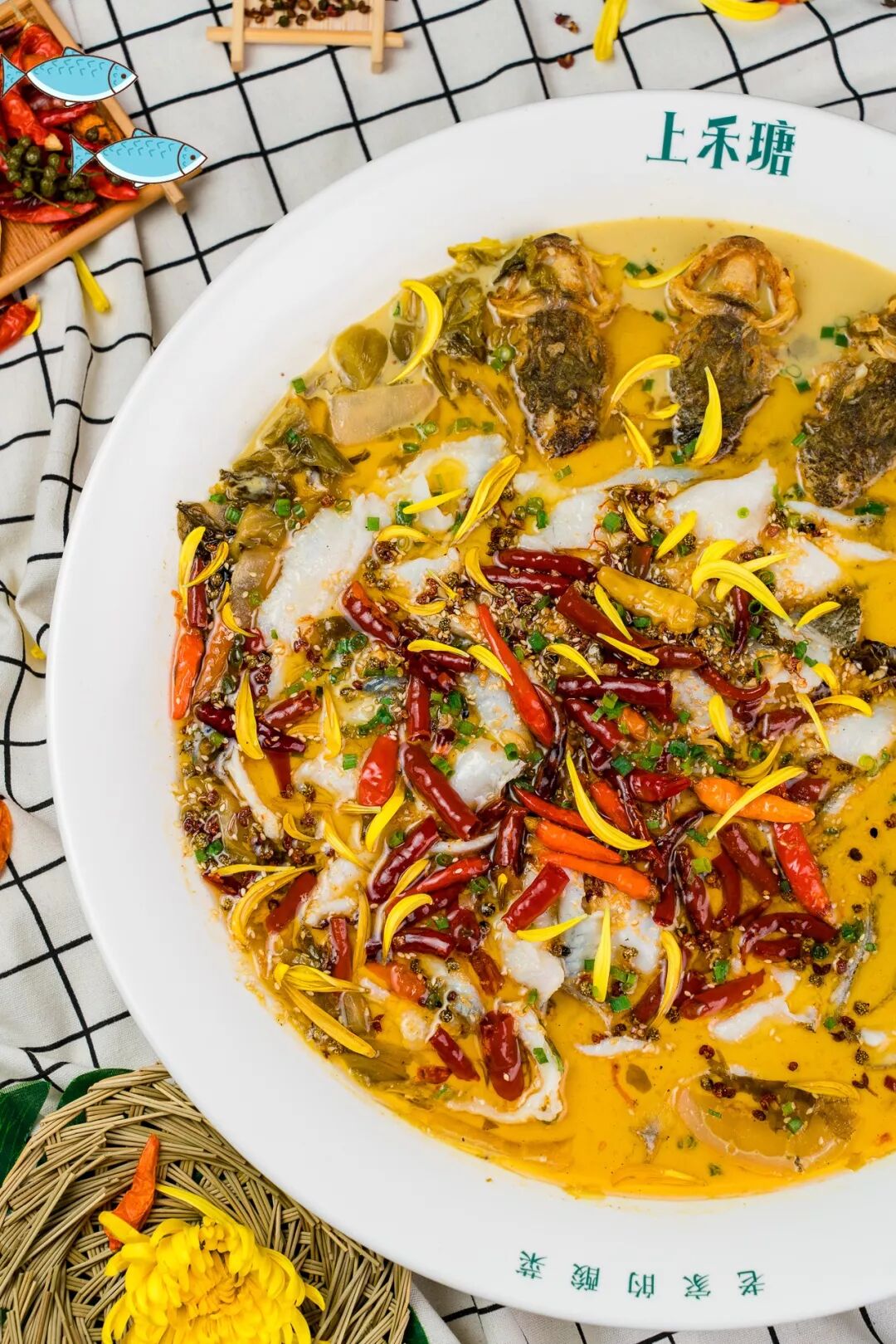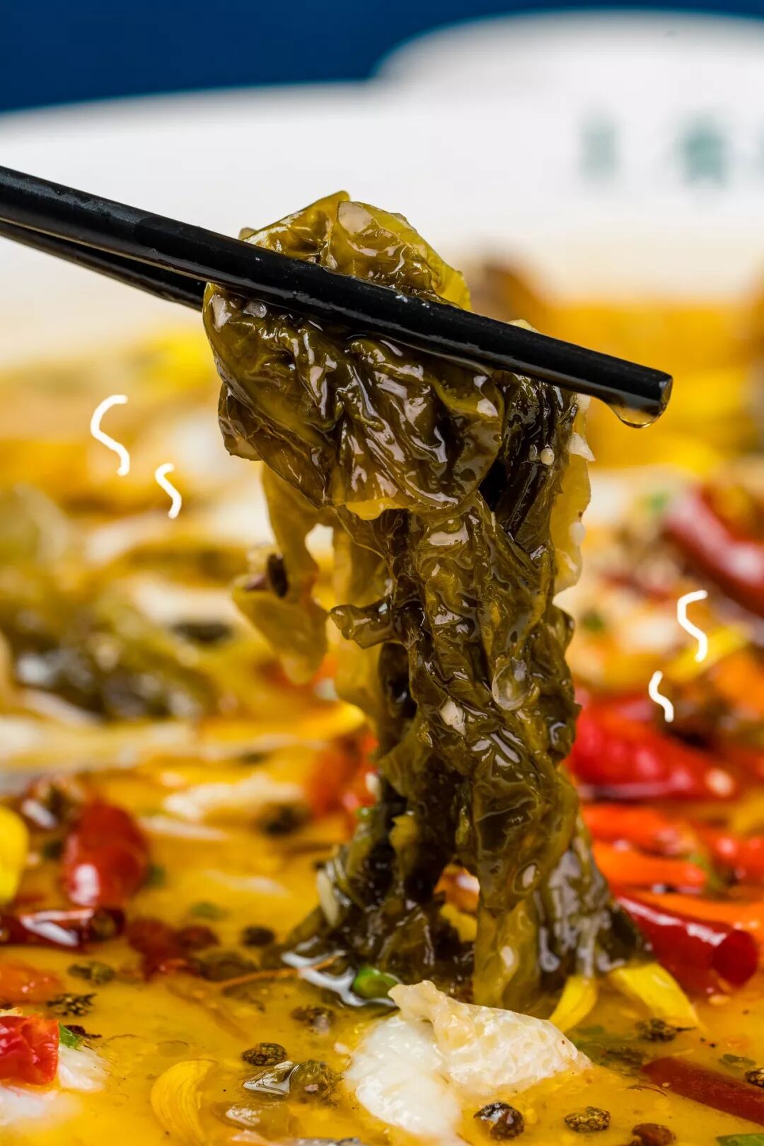 老坛酸菜鱼佐以花椒、辣椒、菊花花瓣、酸萝卜、酸菜等配料提味和提鲜,使得口感上升了一个level。