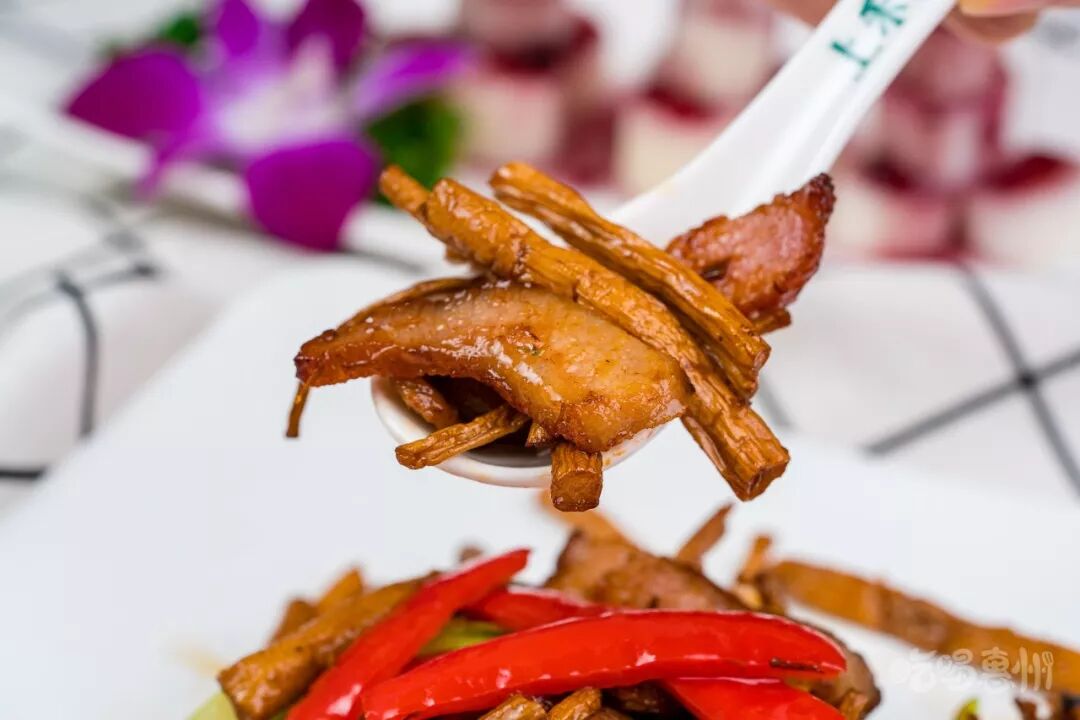 茶树菇鲜嫩爽脆,有一丝甜味,咬上去“咔咔”声响,猪颈肉爽口顺滑,两者一起入口,香味萦绕在口中。