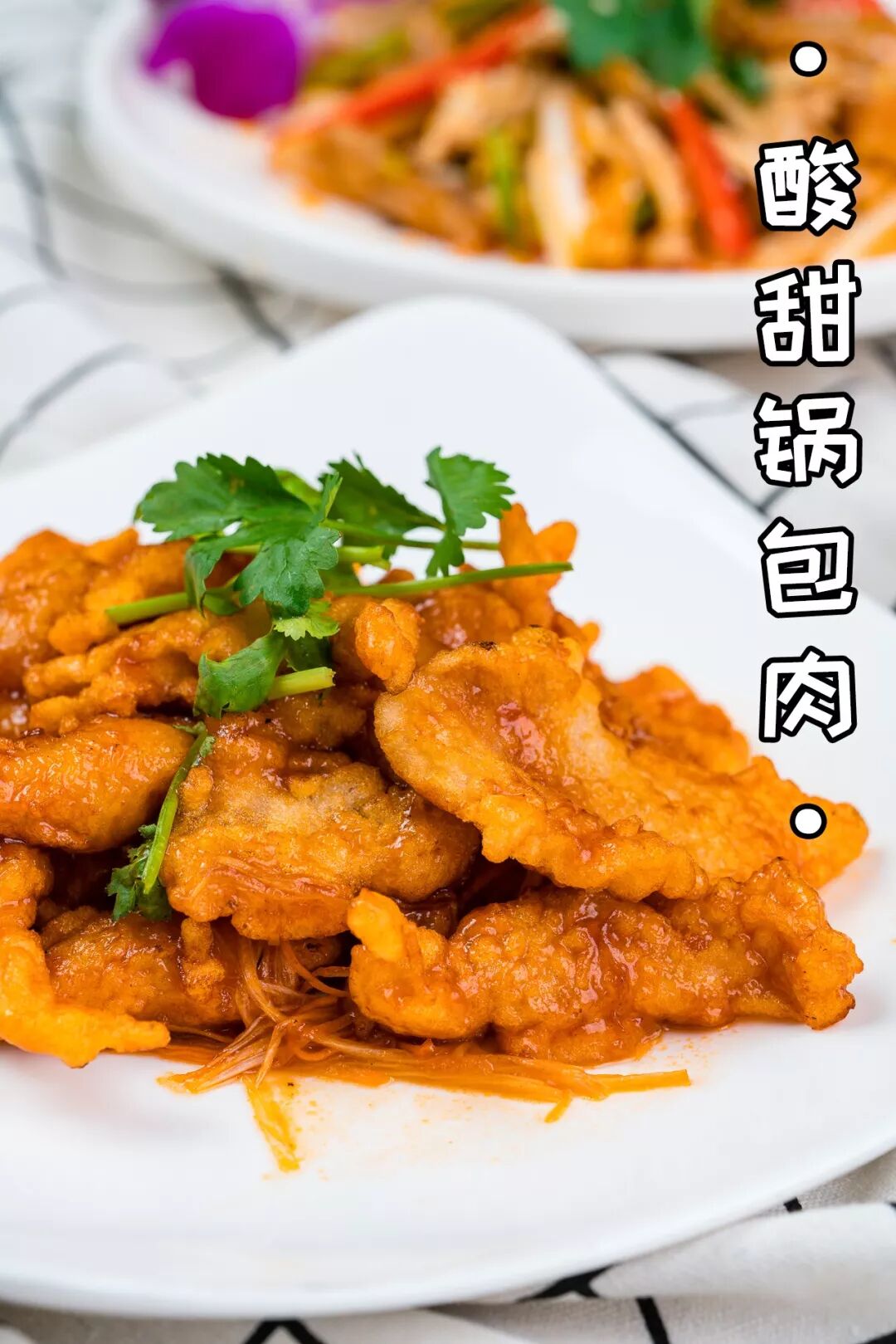 金灿灿的锅包肉,肉炸至金黄捞起,酸甜适口,酥嫩鲜美,味道浓厚,香味勾人。