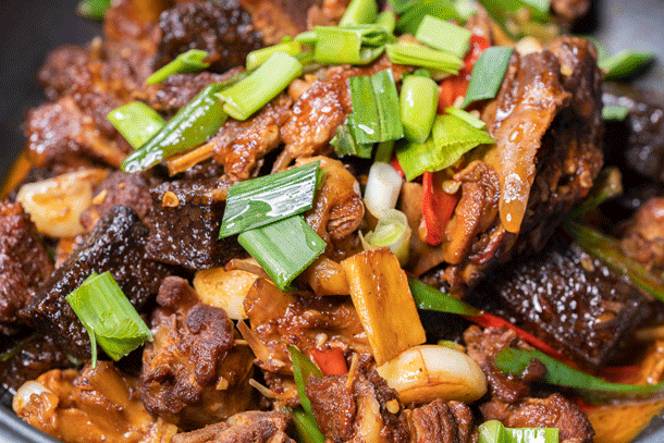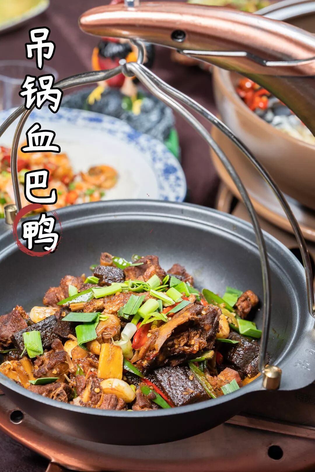 月亮送上桌的吊锅血巴鸭,是一道湖南的经典名菜,佐以鲜辣红椒、浓郁的老姜等配料一起高火烹饪,让人垂涎欲滴。