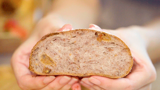 这款面包使用红酒和面,面团天然发酵,再加上被红酒腌制过的桂圆烘焙。成品蓬松柔软,撕开来可明显感受到欧包特有的纤维感。