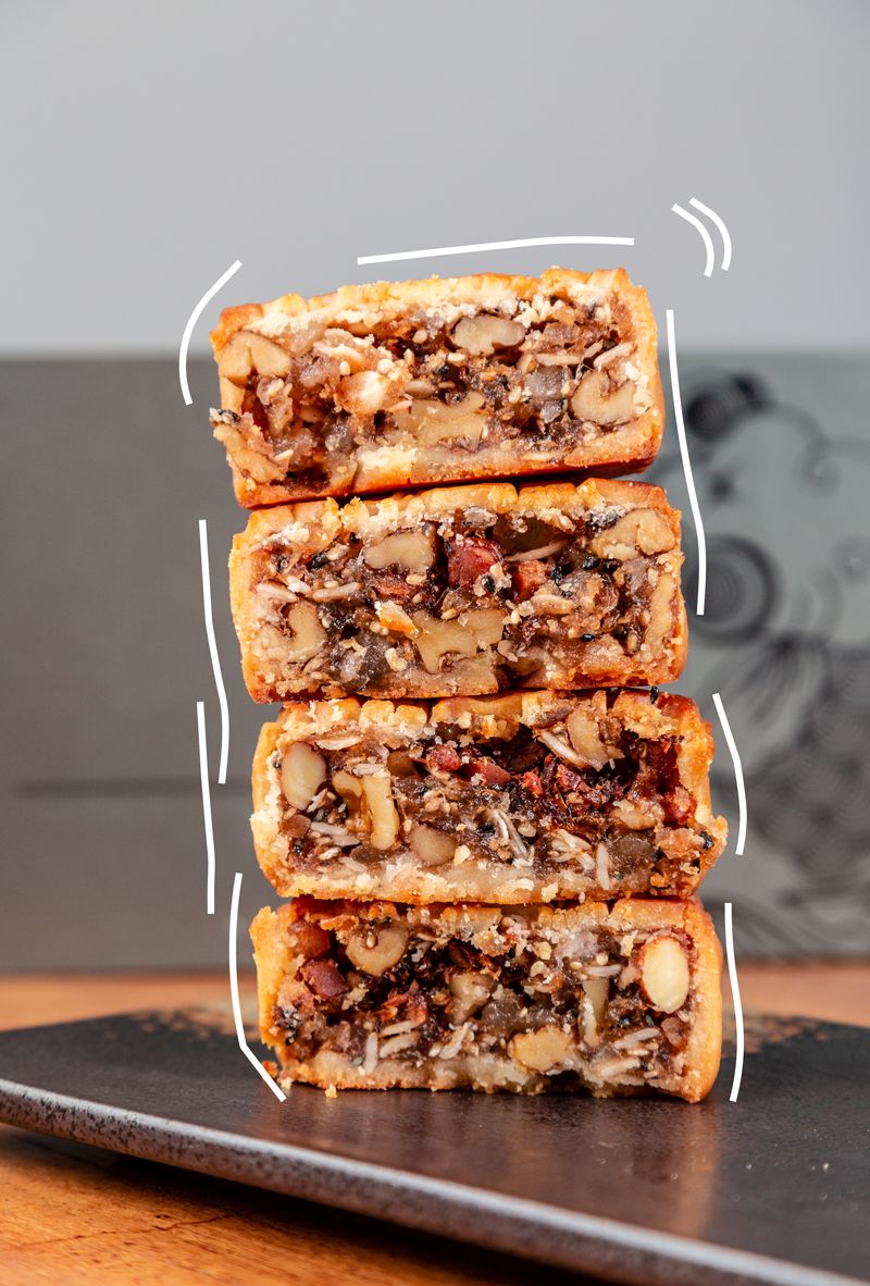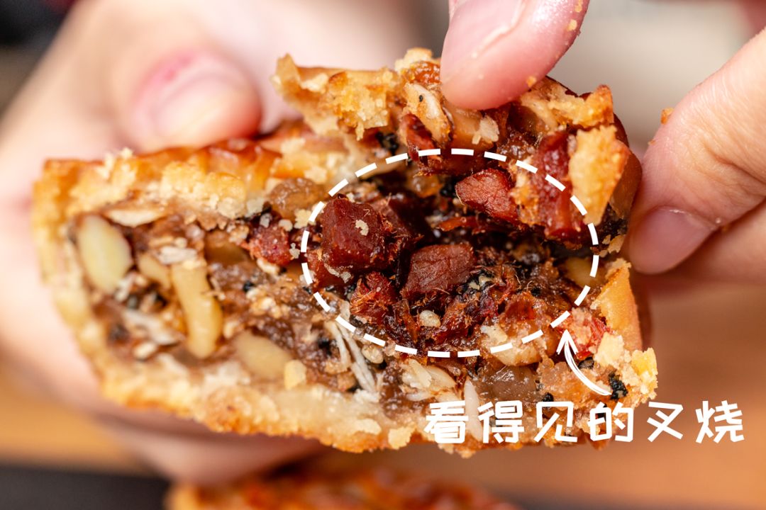 我们从它的外表就能看得出里面紧包裹着的是满满的的馅料,里面有叉烧、猪肉、冬瓜、瓜子仁、橄榄仁、核桃仁、杏仁、黑芝麻、白芝麻等食材,每一个都能看的见。