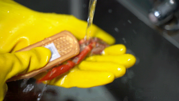 吃小龙虾最怕不干净,所以店内每一只虾下锅前都少不了洗白白,沐浴在水龙头下,360度刷洗。