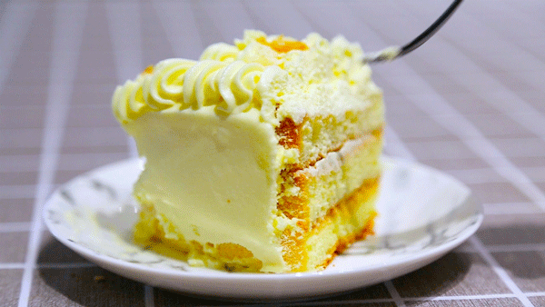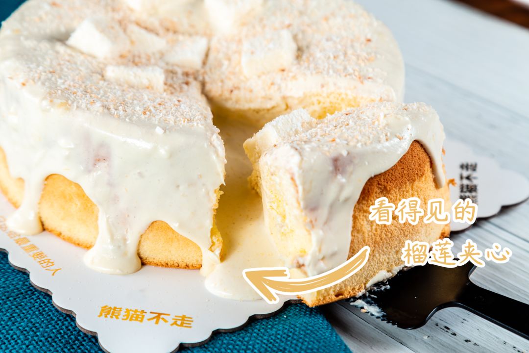 切开蛋糕,榴莲果肉夹心从蛋糕中心缓缓流出,就像熔岩般溢出来一样,让人想起剥开榴莲后果肉呼之欲出的样子。