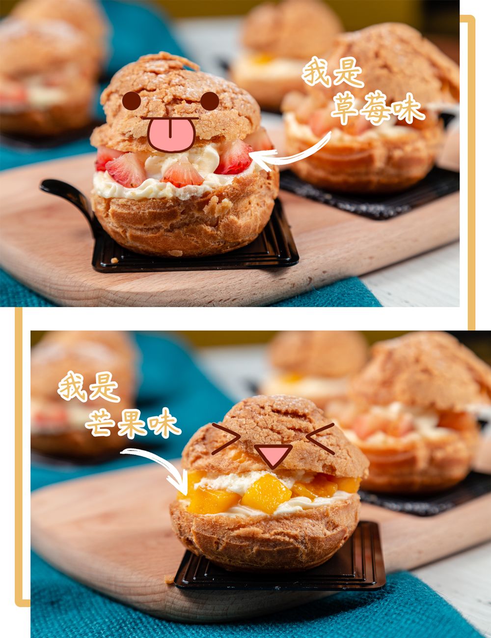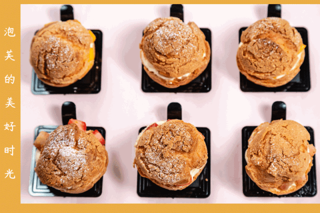 下午茶除了蛋糕之外,当然少不了泡芙,这款水果泡芙是少女的喜爱,酥皮脆韧,夹心绵软,里面还有草莓和芒果两种夹心水果。