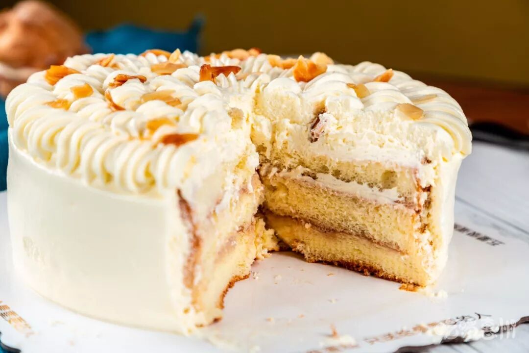 其实它是一款特别纯粹的蛋糕,表层铺上了榛子片,点缀了纯白色的奶油,怎么吃都吃不腻,反而让人越来越爱。