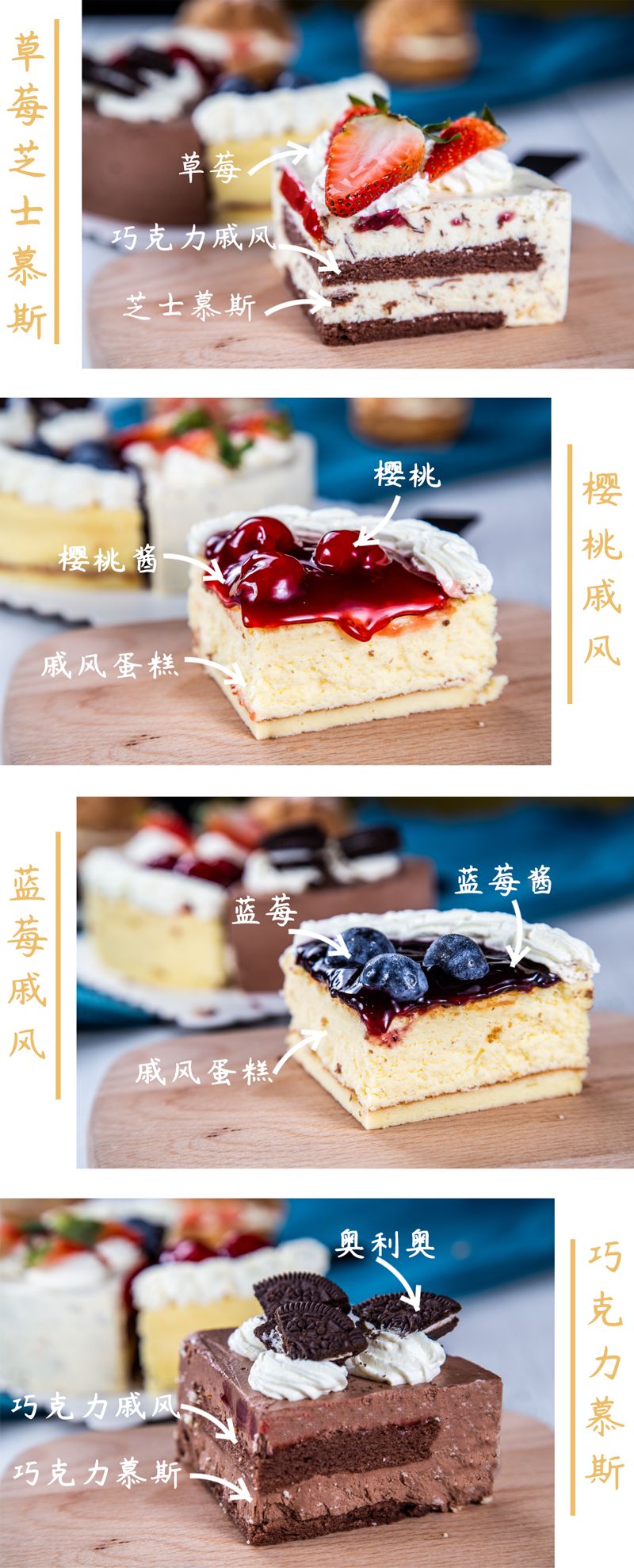 巧克力慕斯、草莓慕斯、蓝莓芝士、樱桃戚风,层层蛋糕有着不一样的诱惑,奥利奥的微苦、草莓的酸甜、蓝莓的甜蜜、樱桃的独特,无一不刺激着味蕾。