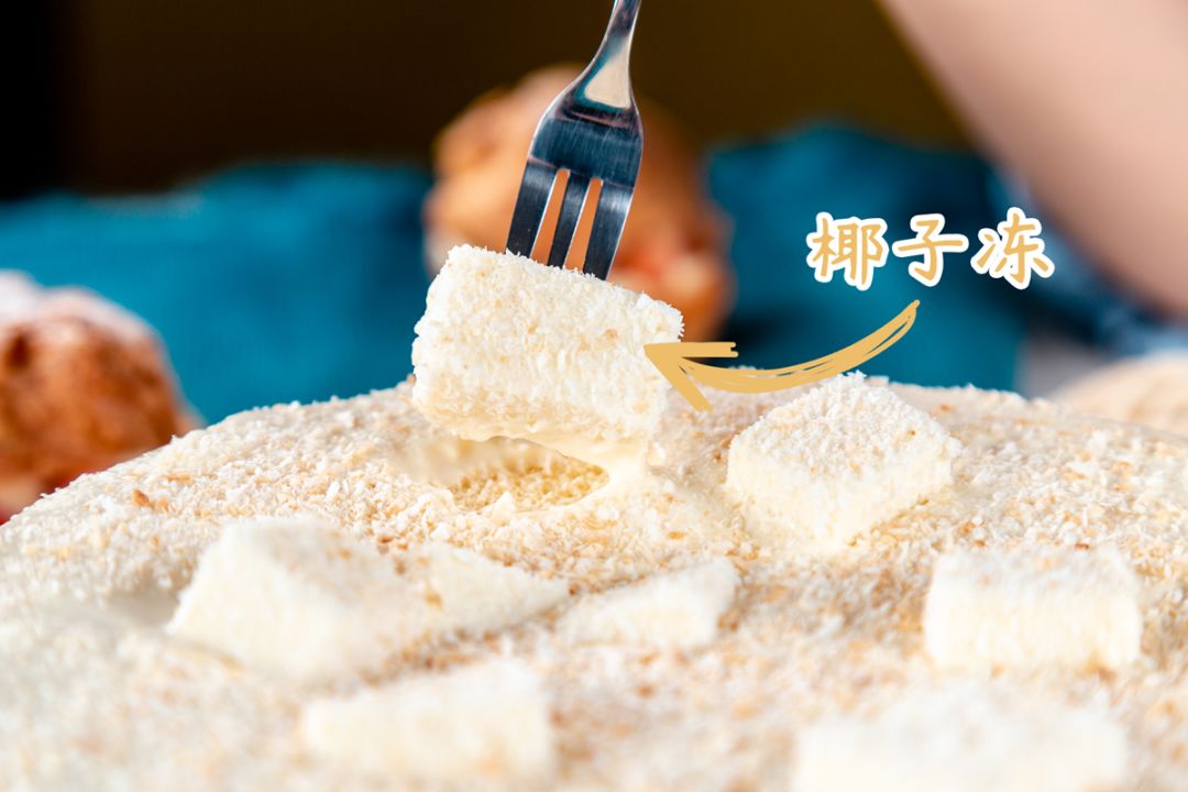 蛋糕表层铺满了一层薄薄的椰丝和菲律宾椰冻,椰冻冰凉顺滑,入口即化,椰丝混合着椰冻,为蛋糕的增添了一丝香气。