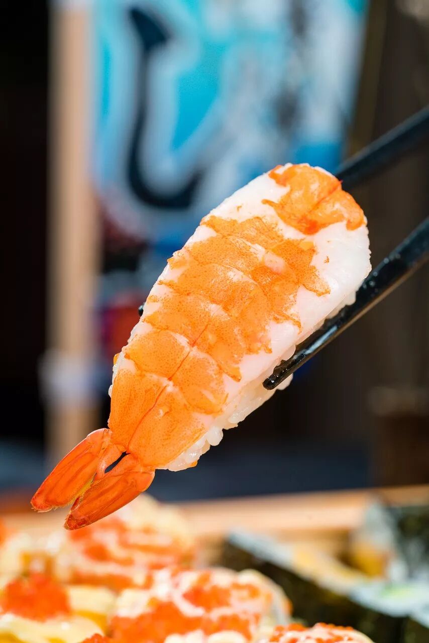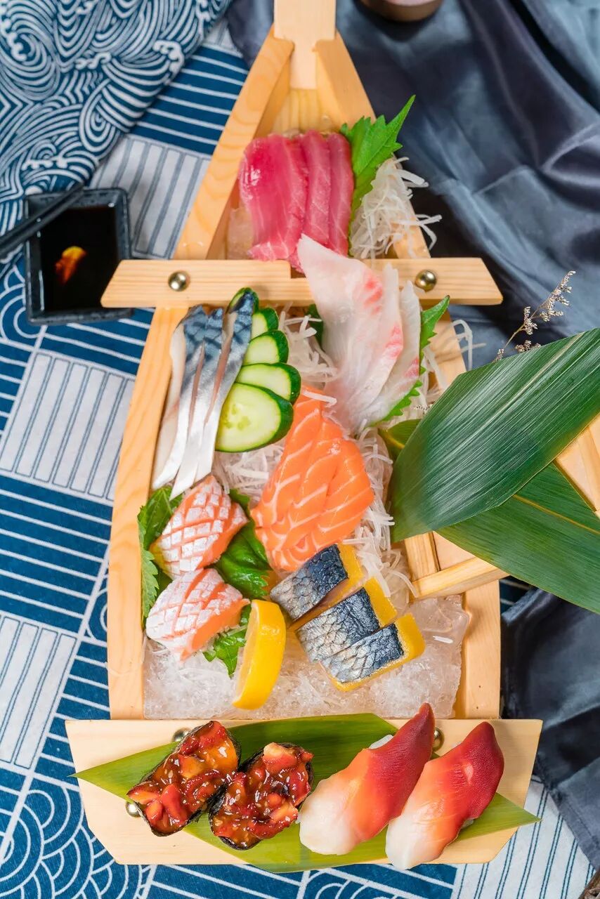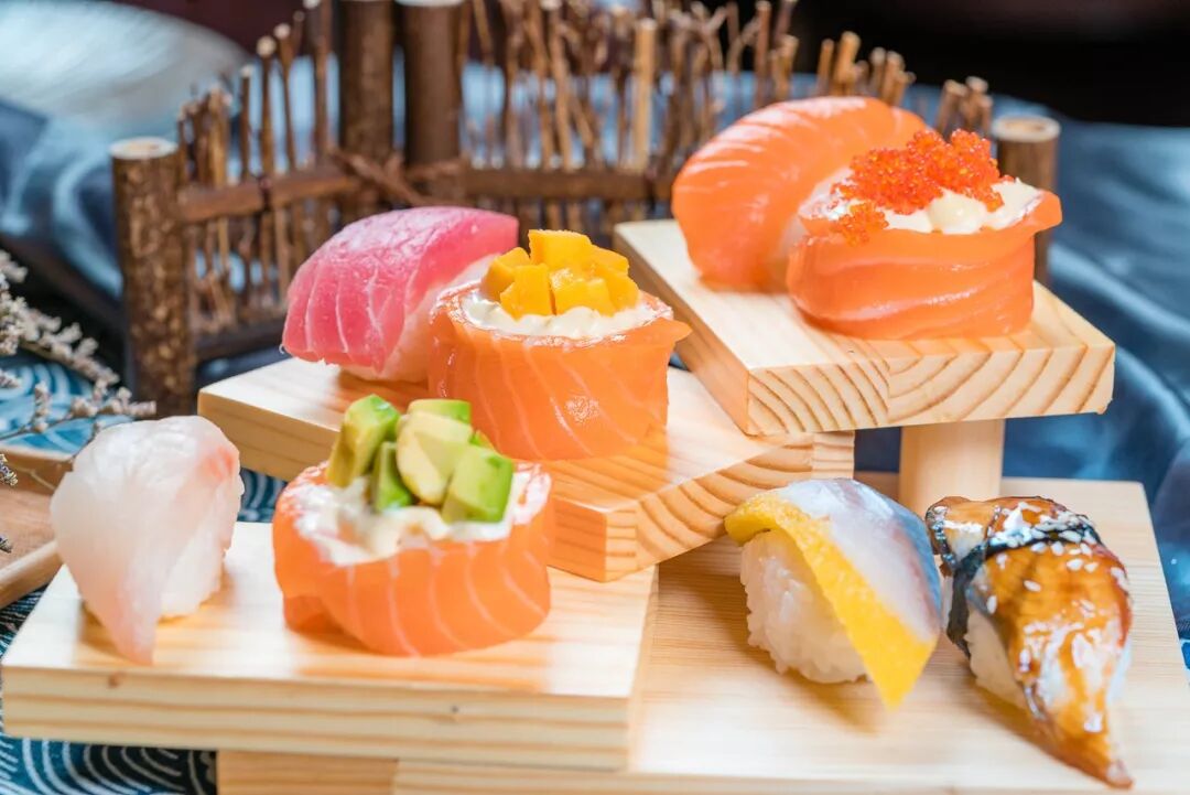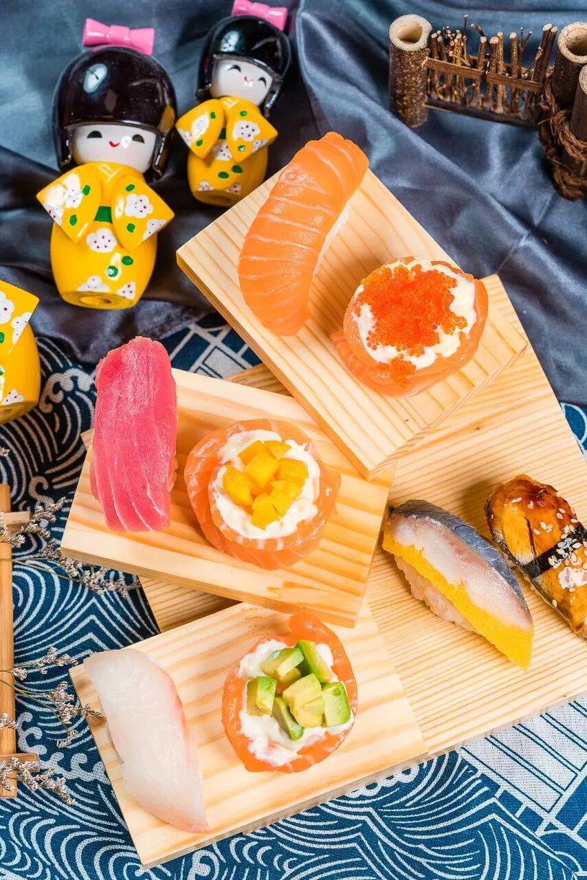 三文鱼寿司、吞拿鱼寿司、芒果鱼籽寿司
