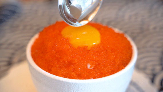 这道蟹籽拌饭,营养指数十分高,红蟹籽和寿司饭,再加上一个生蛋黄,三者搭配在一起,不但没有违和感,吃起来口感还蛮丰富的。
