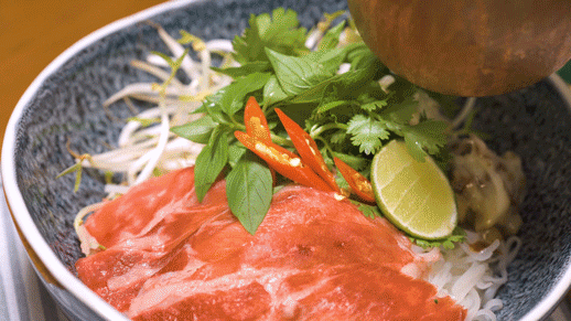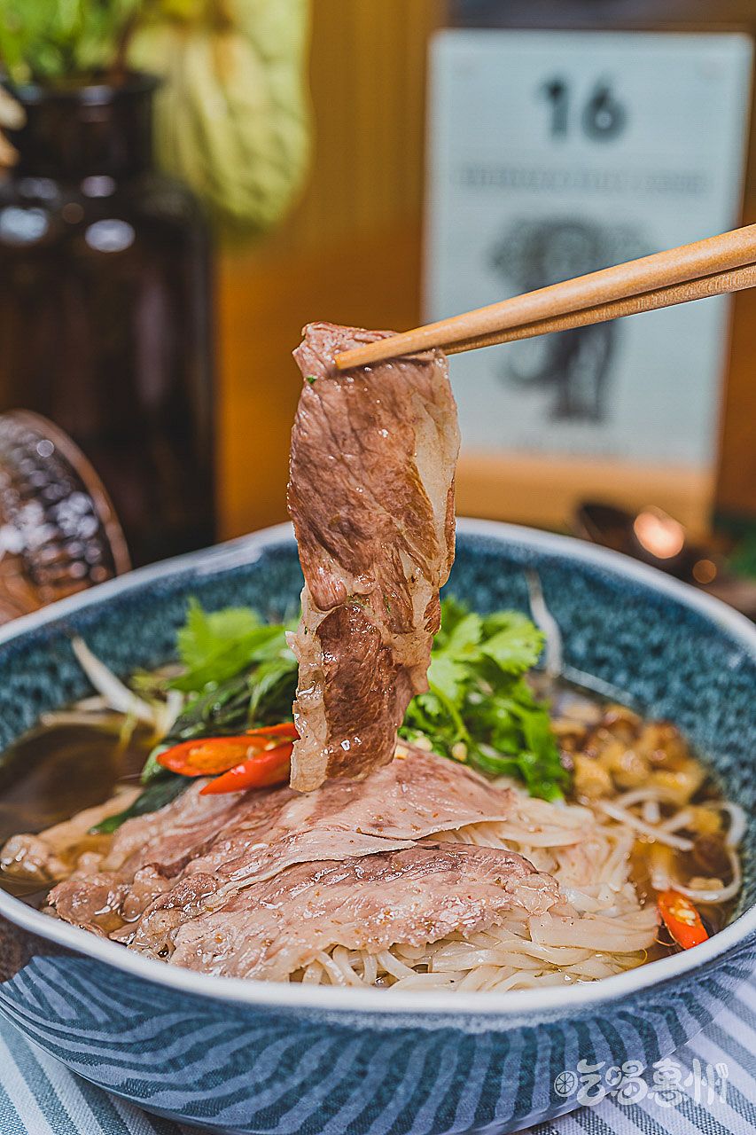 煮粉的时间把控好,也是让粉入口口感的关键,牛小排薄片熟度让口感变得香嫩,放入自制猪油渣,金不奂,泰国芫西。