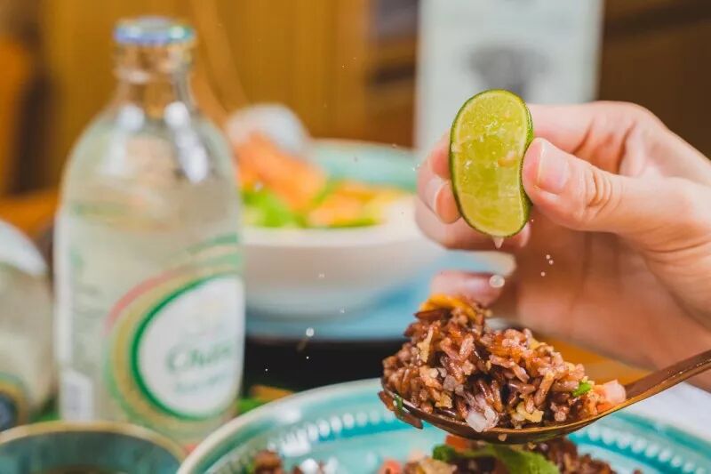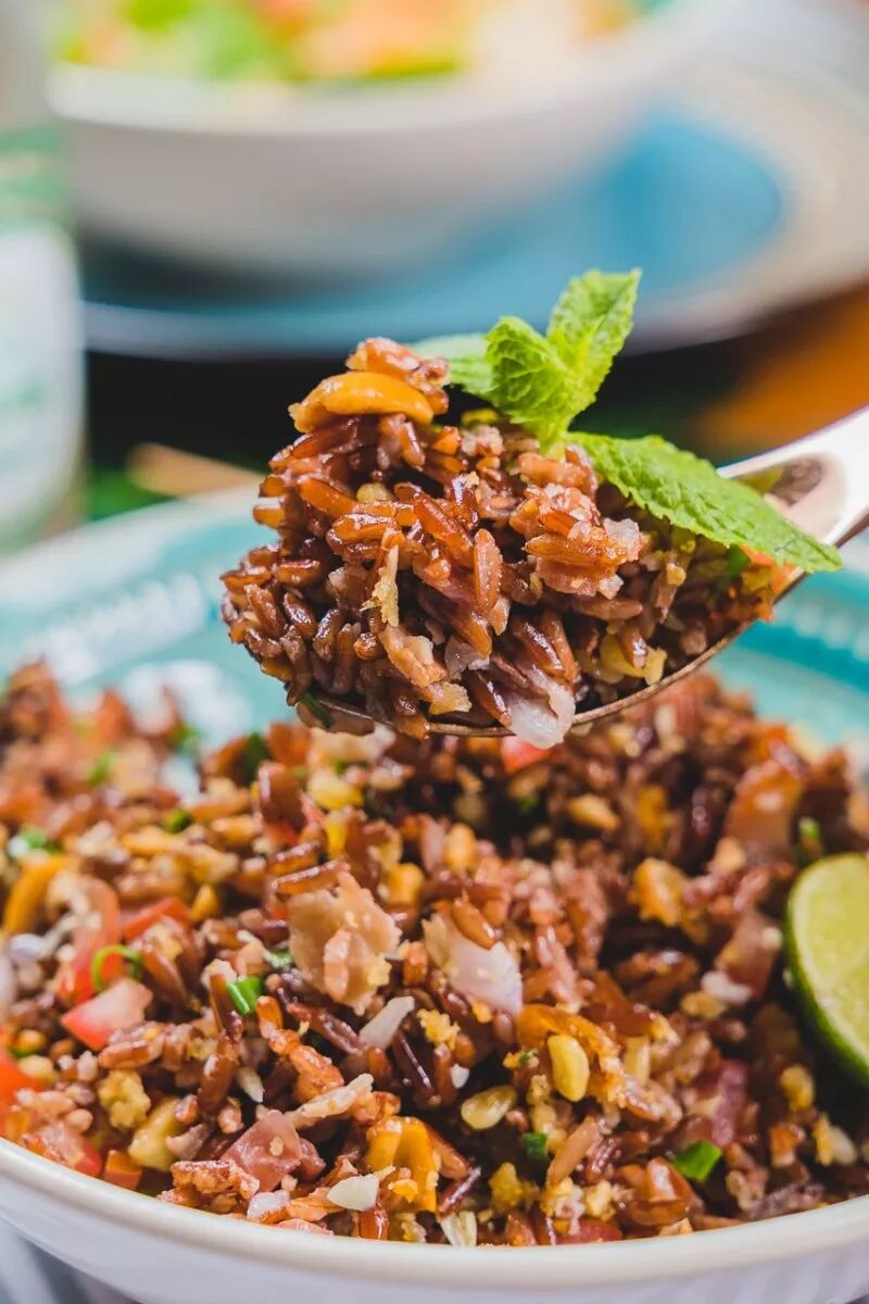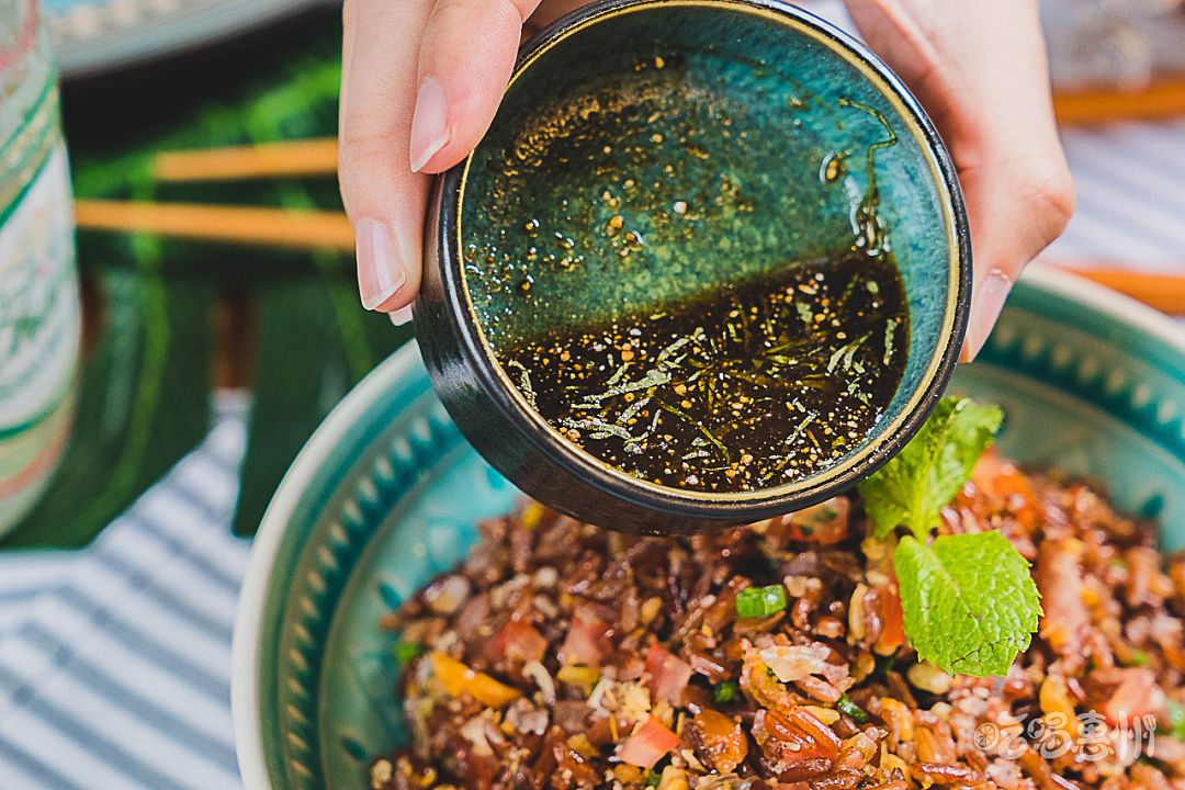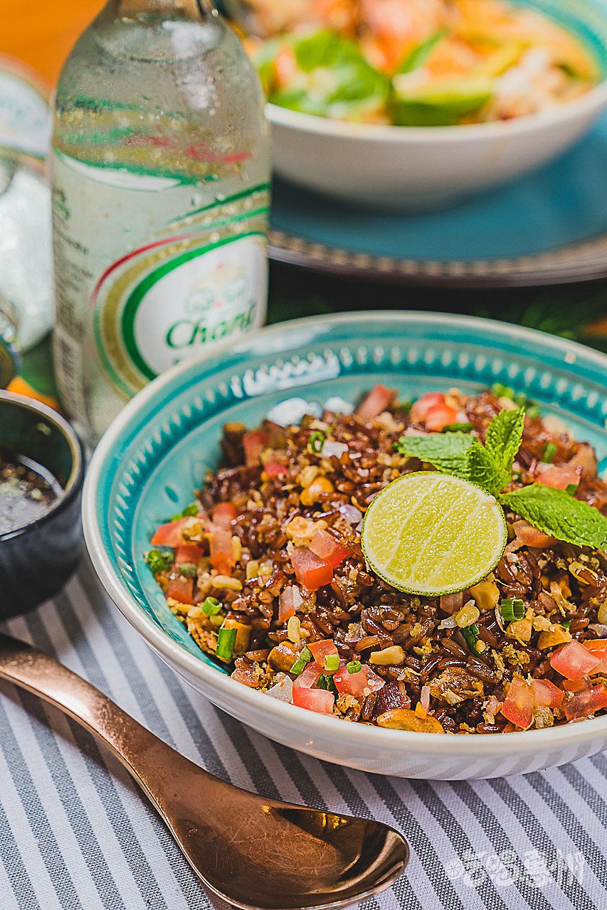 选用的是泰国红米作底,配料除了椰浆、培根碎、洋葱碎外,还加入了花生碎、腰果碎、番茄和柠檬碎,口感层次丰富。